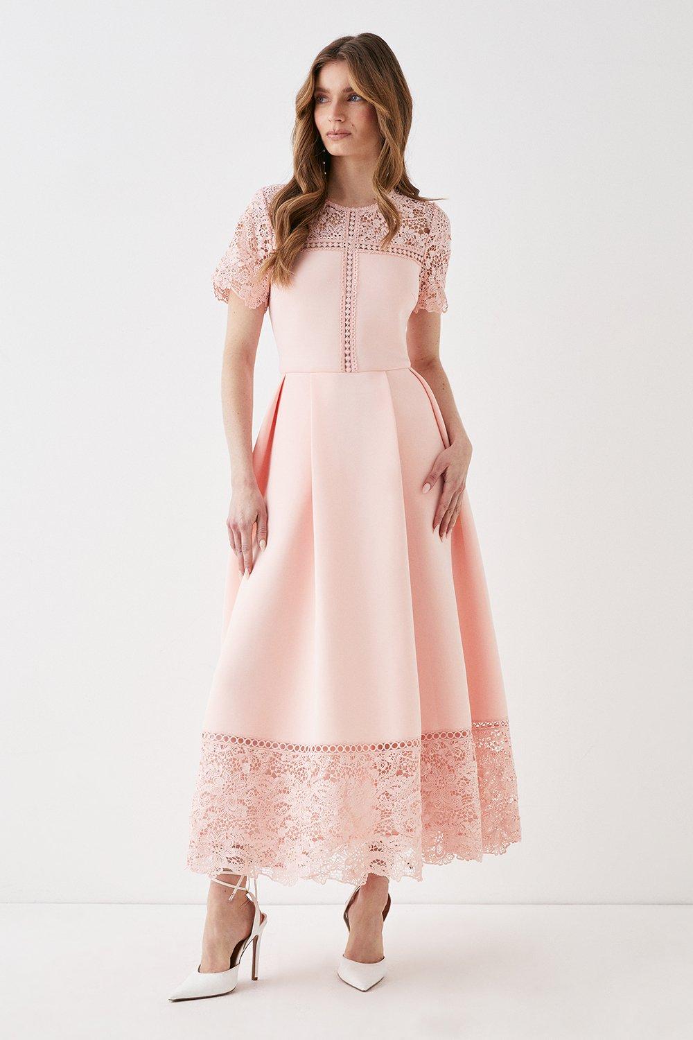 Puff Sleeve Flute Hem Lace Midi Dress