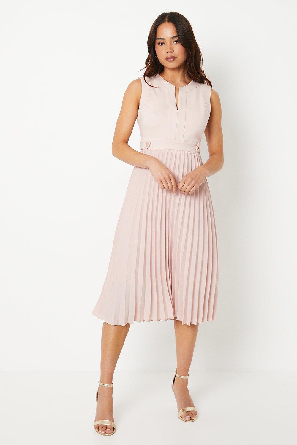 Petite Ponte Top Sleeveless Dress With Pleated Midi Skirt