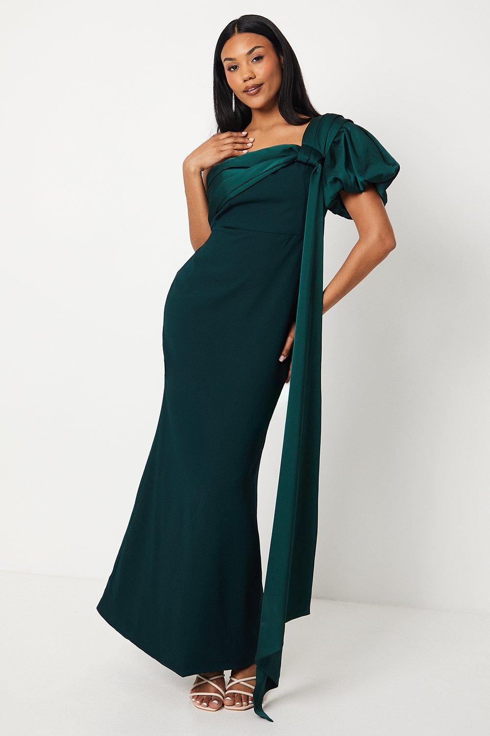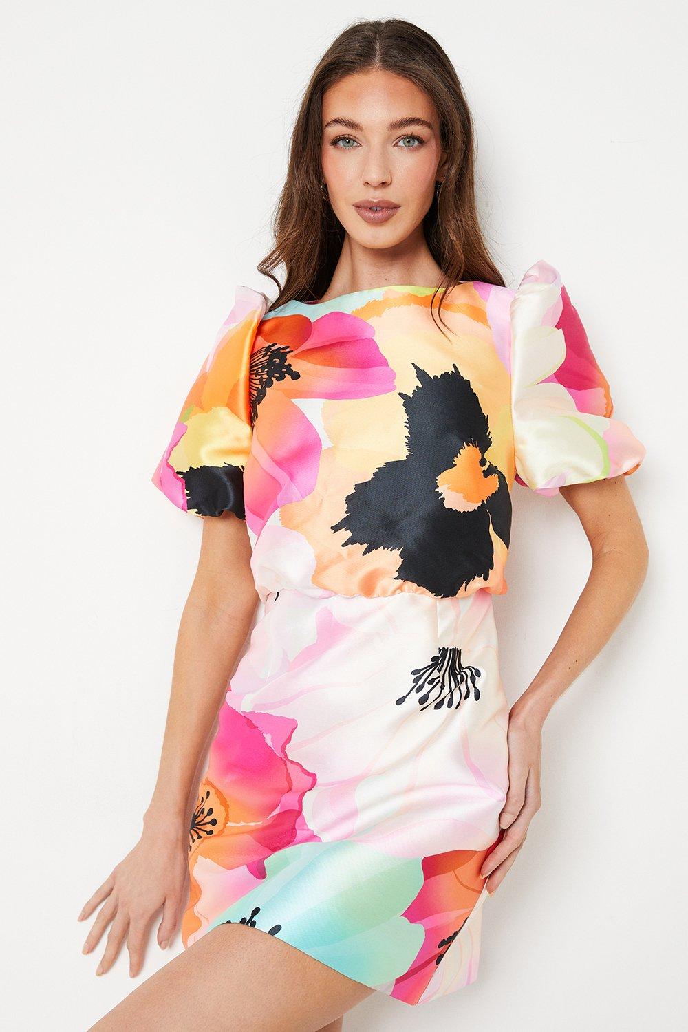 Printed Organza Pencil Dress With Puff Sleeve