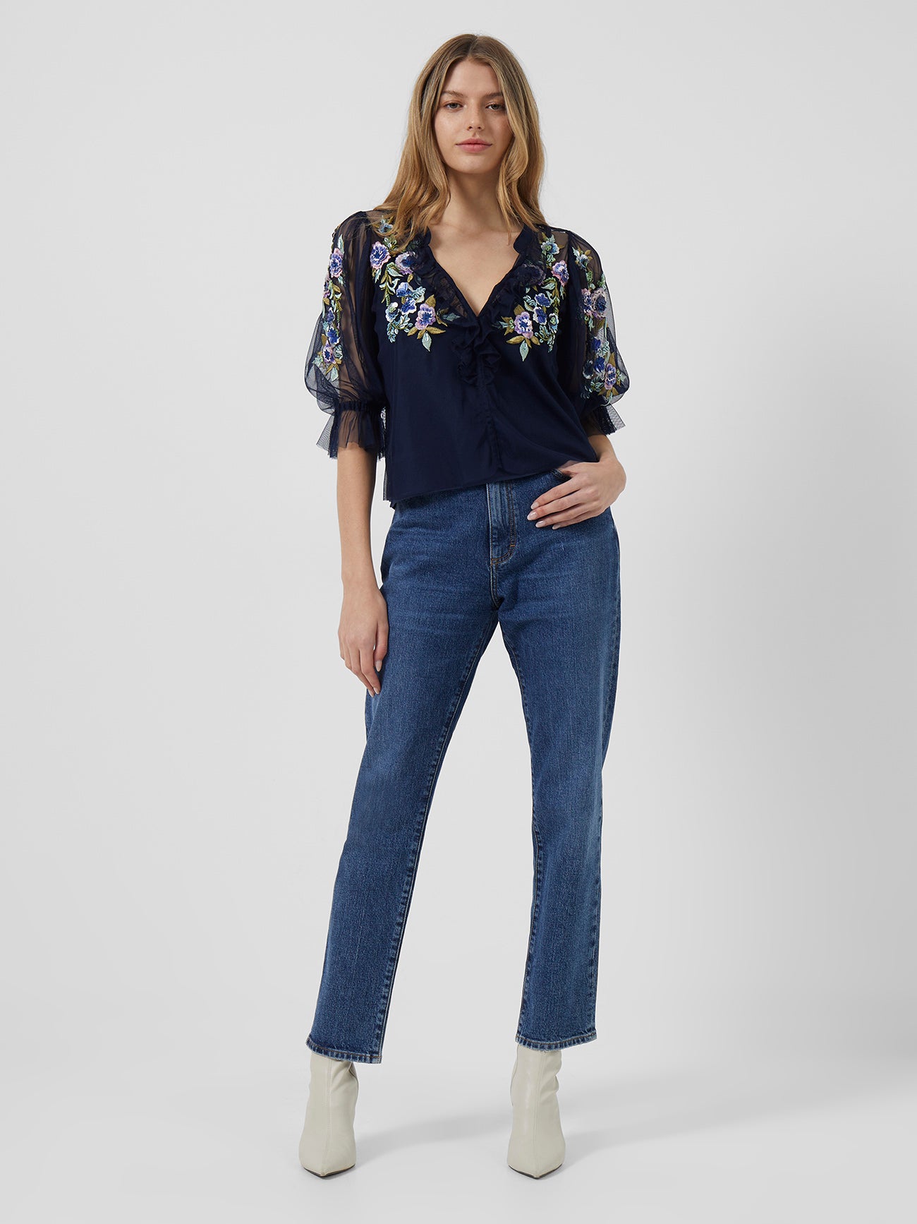 Ambre Embroidered Cluster Puff Sleeve Top Indigo French Connection £45.00 -
