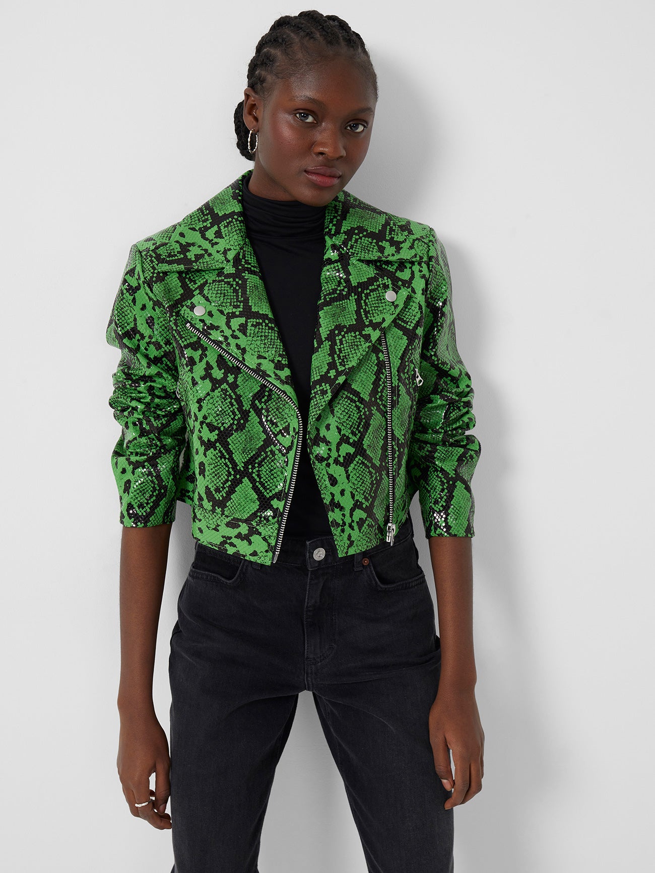Elisa Snake Vegan Leather Cropped Biker Jacket Island Green Multi French Connection £37.00 -