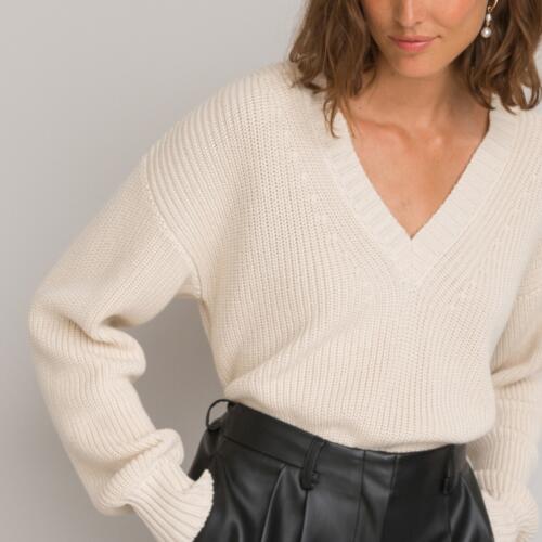 Ribbed Cotton Mix Jumper with V-Neck La Redoute Collections -