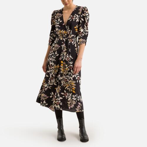 Womens Black Floral Print Ruffle Sleeve Empire Midi Dress