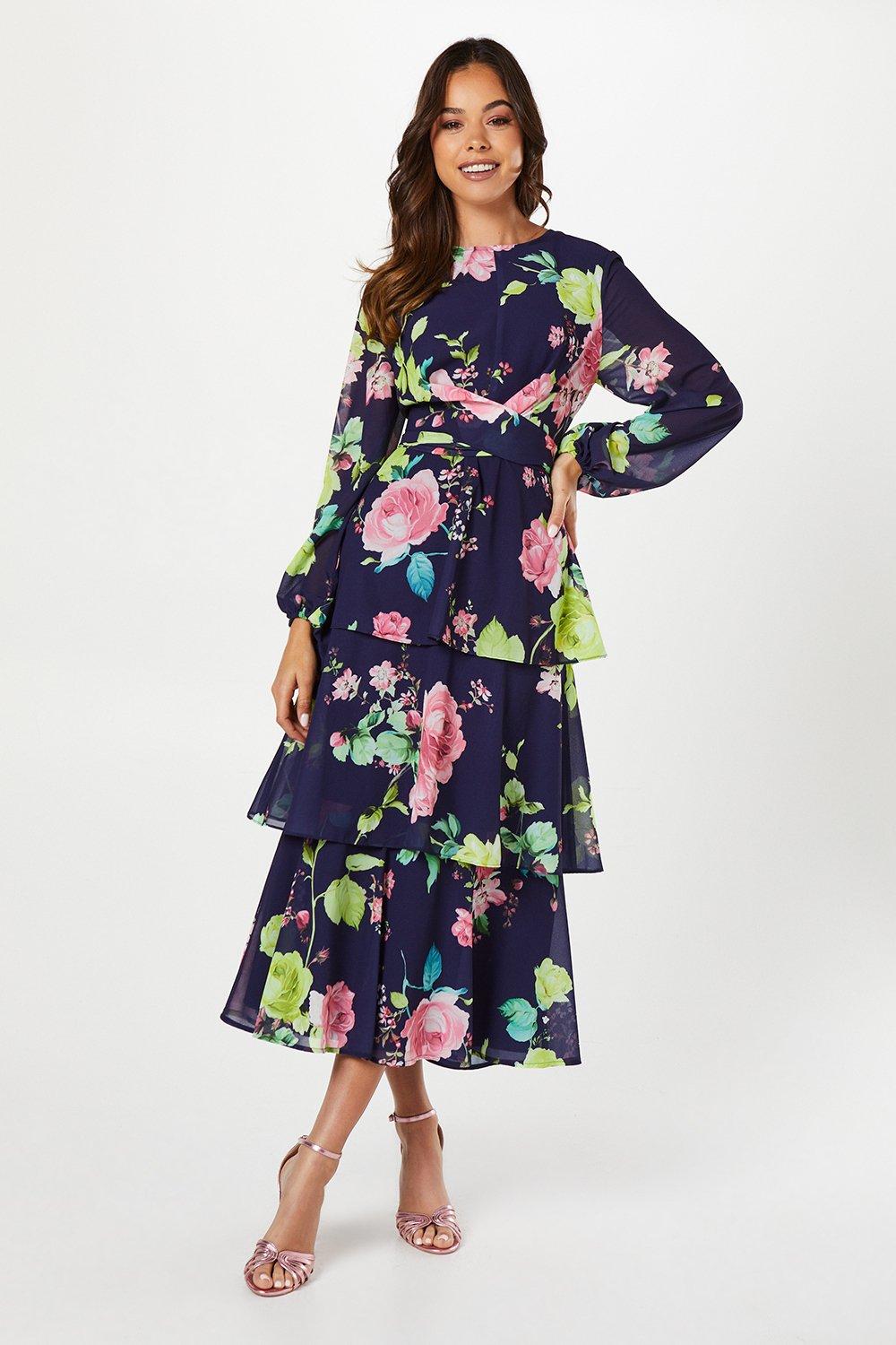 Collared Wrap Bodice Drape Crepe Midi Dress