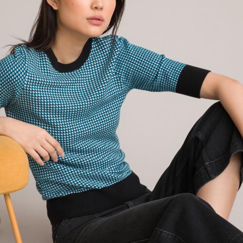 Jacquard Crew Neck Jumper with 3/4 Length Sleeves La Redoute Collections -