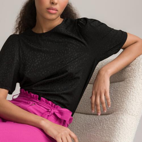 Lima Satin Jacquard Blouse with Puff Sleeves and V-Neck