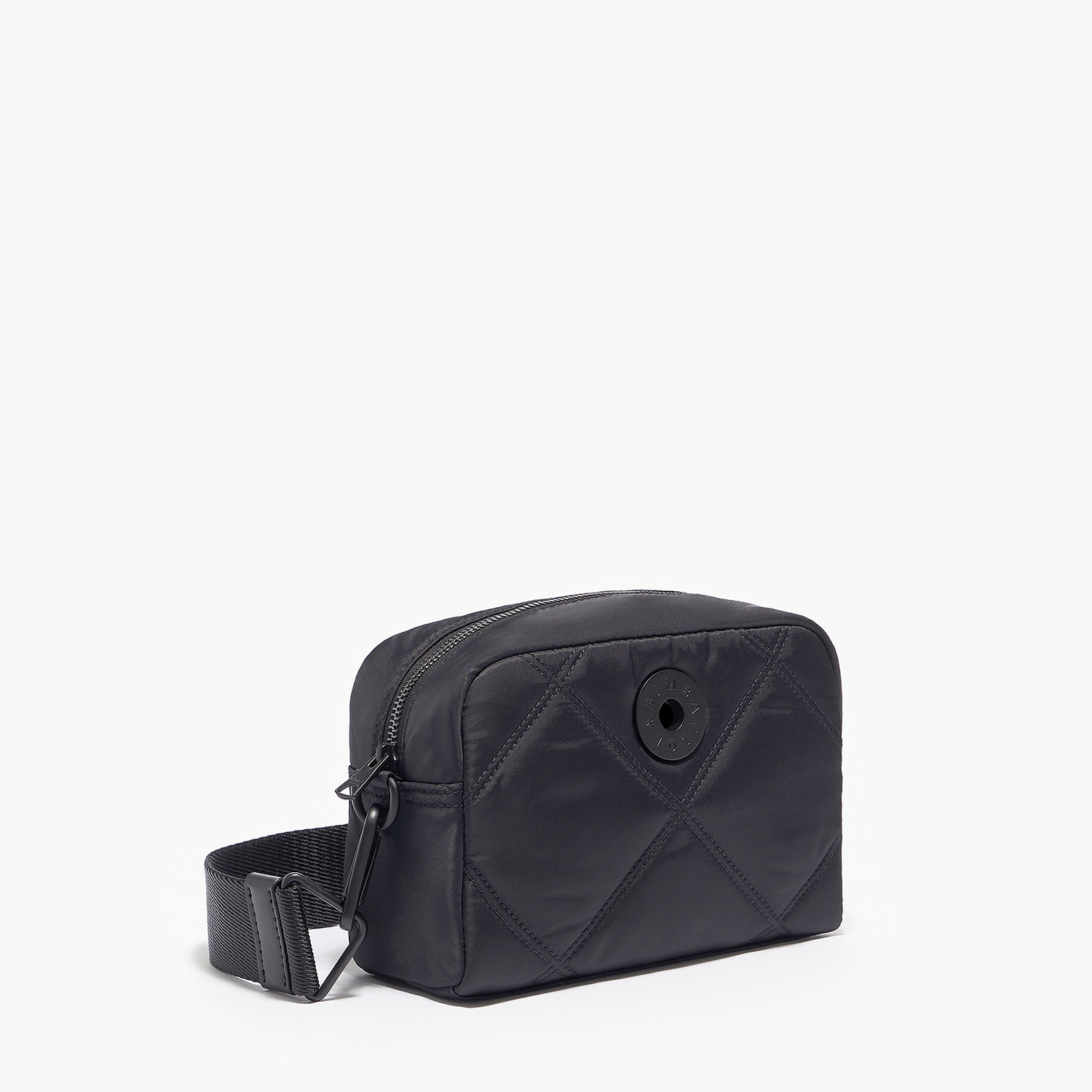 Padded nylon crossbody bag in black. Small model with zip fastener, flat interior pocket and detachable logo strap. Exterior customized with Chimo logo. This model contains 100% Recycled polyester + 100% Recycled polyamide.