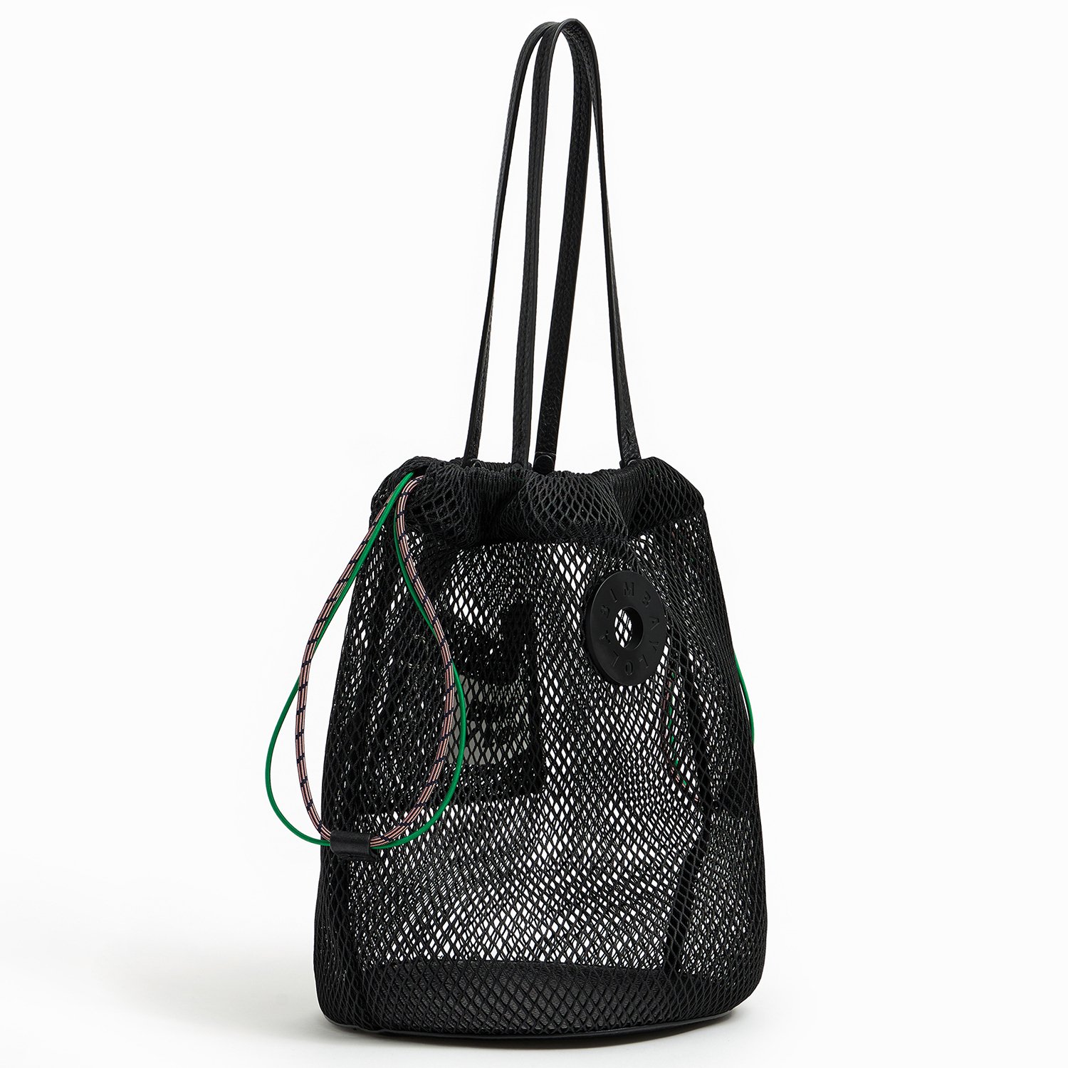 Mesh shoulder bag with circular leather base in black. Model with drawstring fastener and interior pocket.