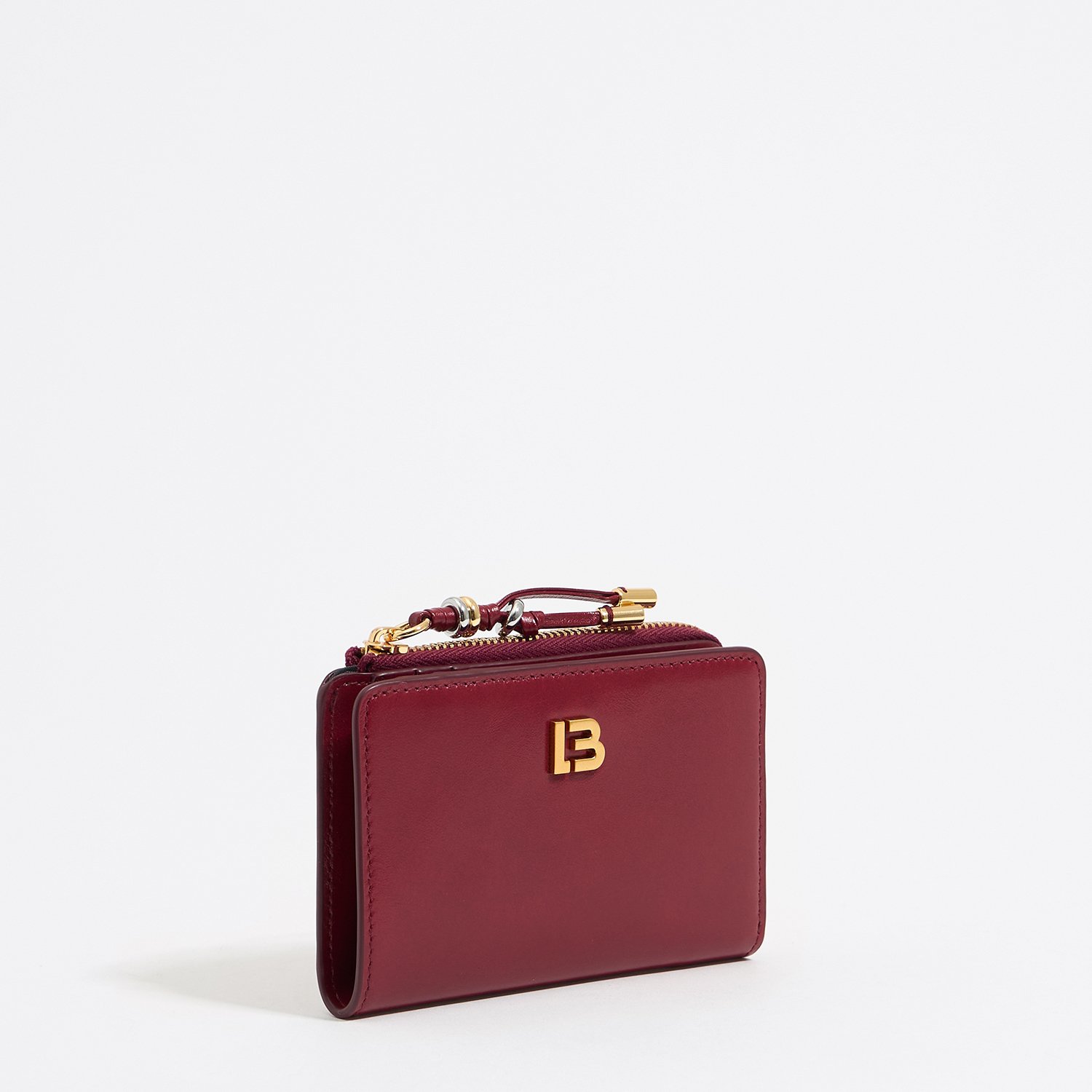 Leather purse in raspberry. Model with snap and zip fastener, rope pull, and interior coin purse and card holder. Exterior customized with metallic logo.