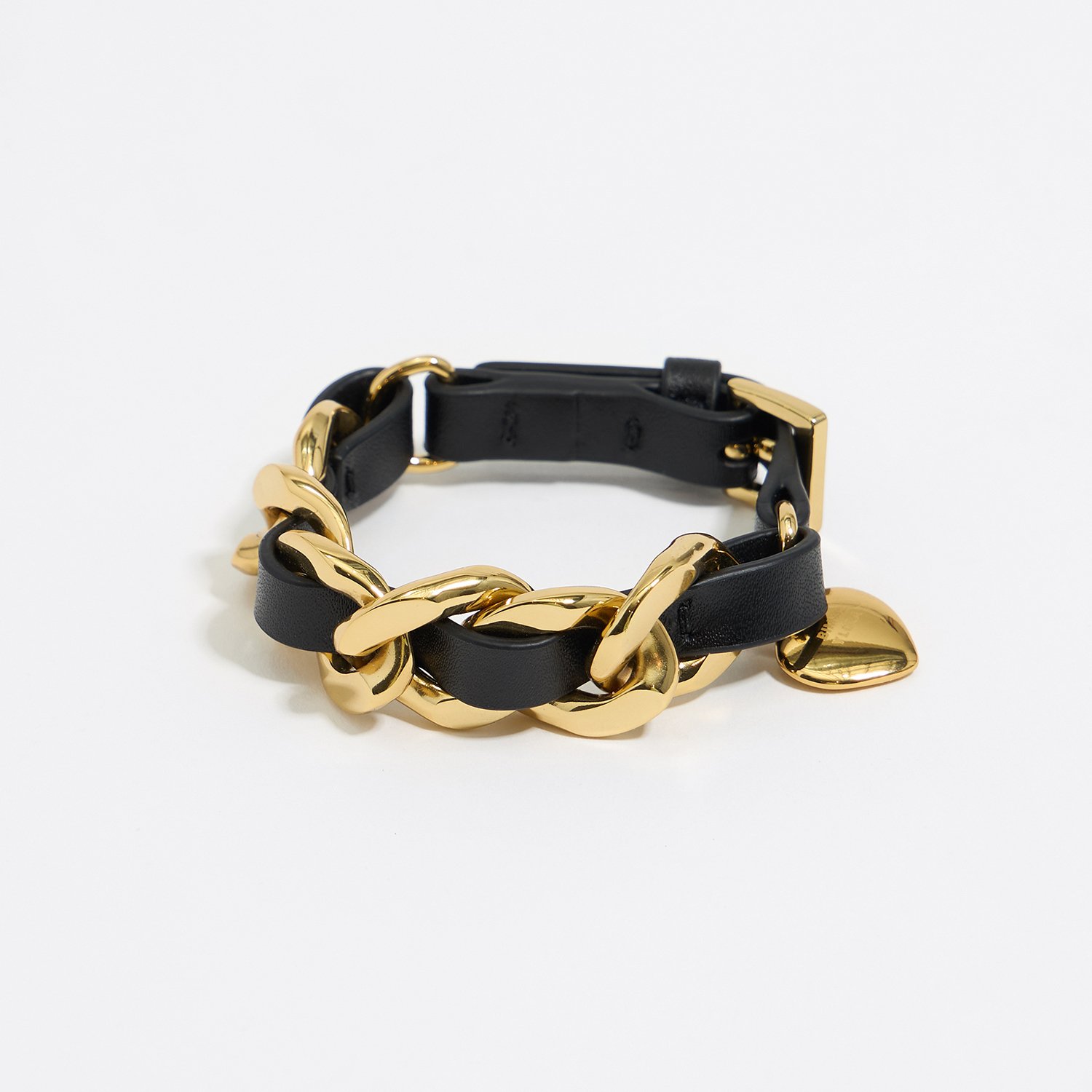 Bracelet with black strap and gold chain. Model customized with engraved logo.