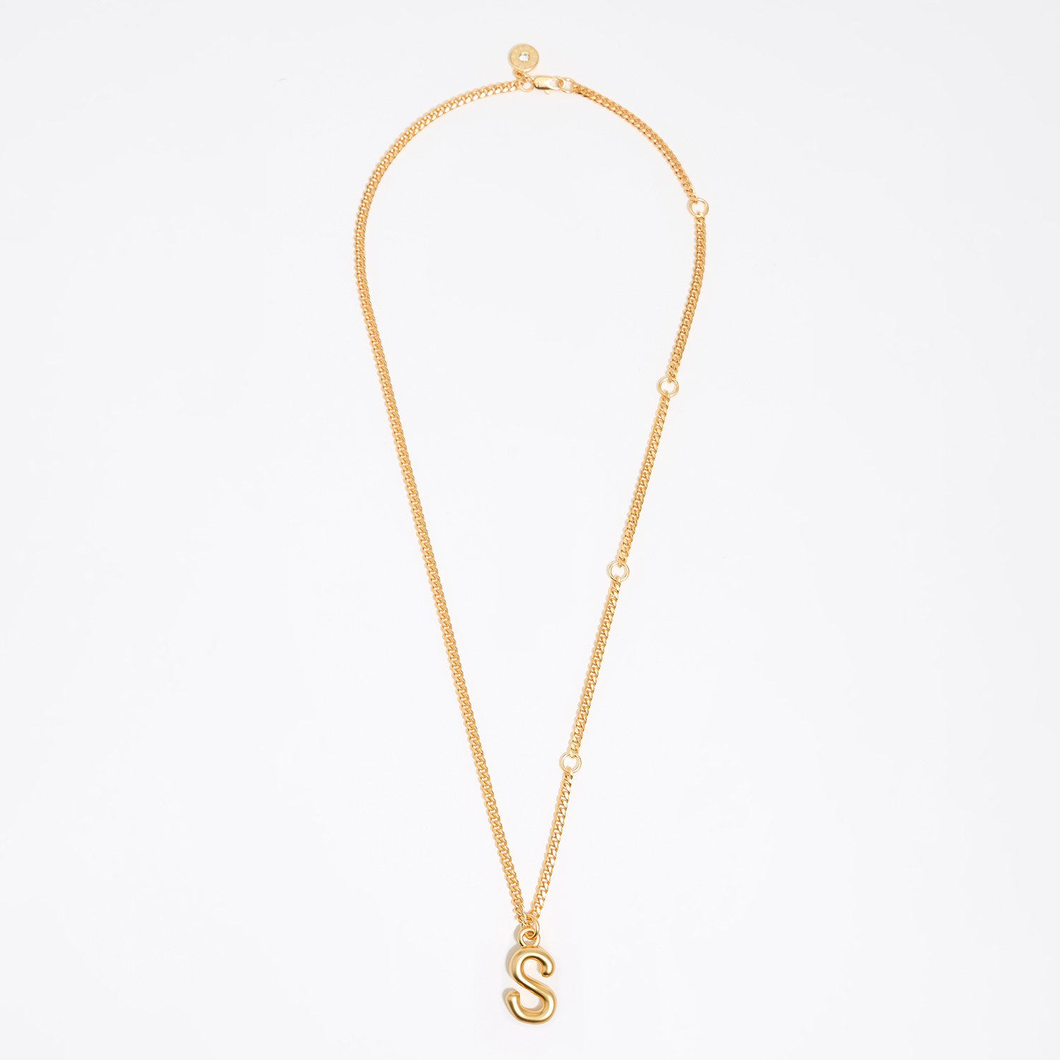 Gold-tone metal chain necklace with letter S pendant. Model customized with engraved logo.