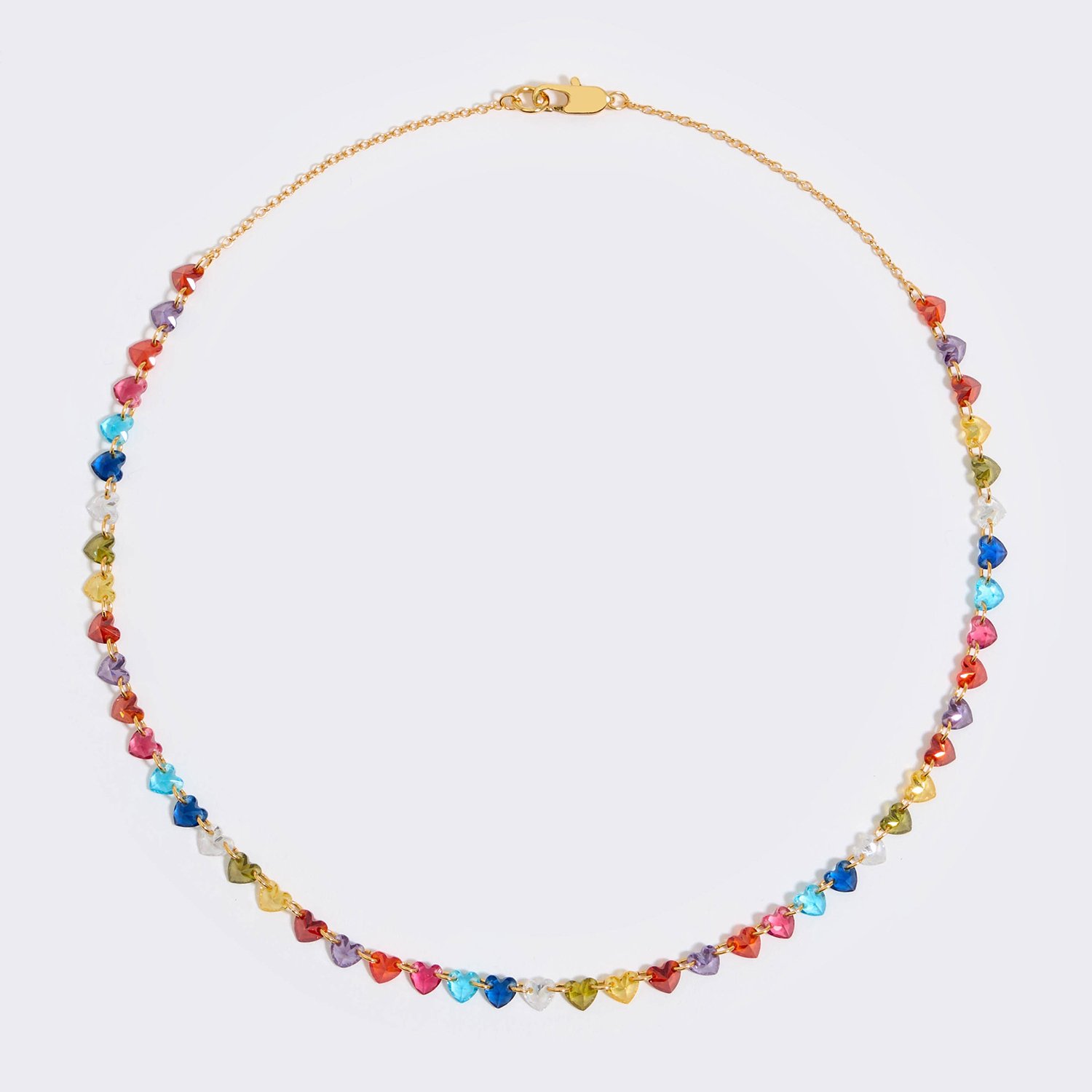 Short necklace with multicolored heart-shaped crystals and golden chain. Personalized carabiner clasp with engraved logo.