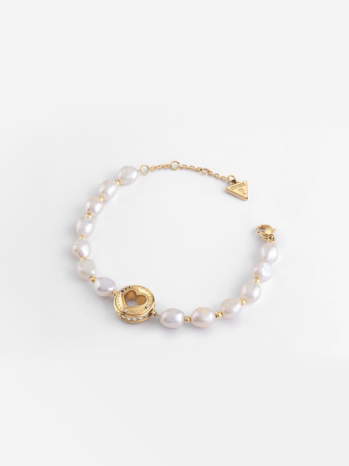 Plated steel bracelet with pearls.Genuine cultured freshwater pearl.Heart-shaped charm with logo lettering engraving.Cubic zirconia appliqué.Snaphook opening.Length of size S: 14.6 cm / 5‚7 in with 3.8 cm / 1‚5 in tail chain.Charm: 14 mm / 0‚6 in.