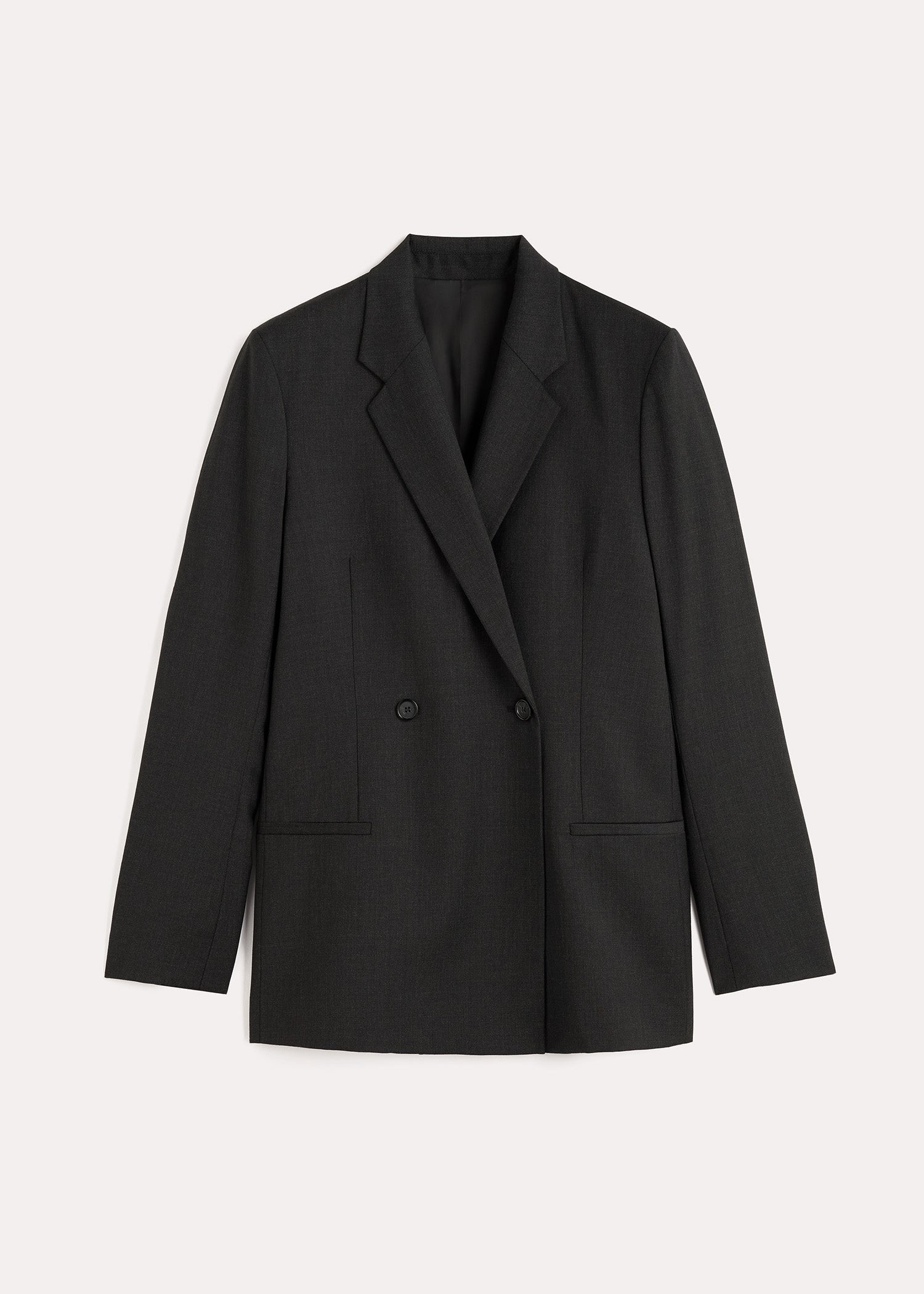 Toteme Blazer Charcoal The TOTEME signature double-breasted blazer is expertly woven from traditional suiting wool and features prominently padded shoulders, sleek jet pockets, and a luxurious full satin lining. You can opt to wear it in an oversized manner for a bold and avant-garde appearance, or alternatively, select a smaller size, going one or two sizes down, for a more snug and tailored fit. HIGHLIGHT Slit pockets Ebony satin interior, inner pocket Double-Breasted Button Front Oversized fit Composition 100% Wool; lining: 100% viscose Product ID: WRTWBL208FB0025-019 Season: FW23 Collection