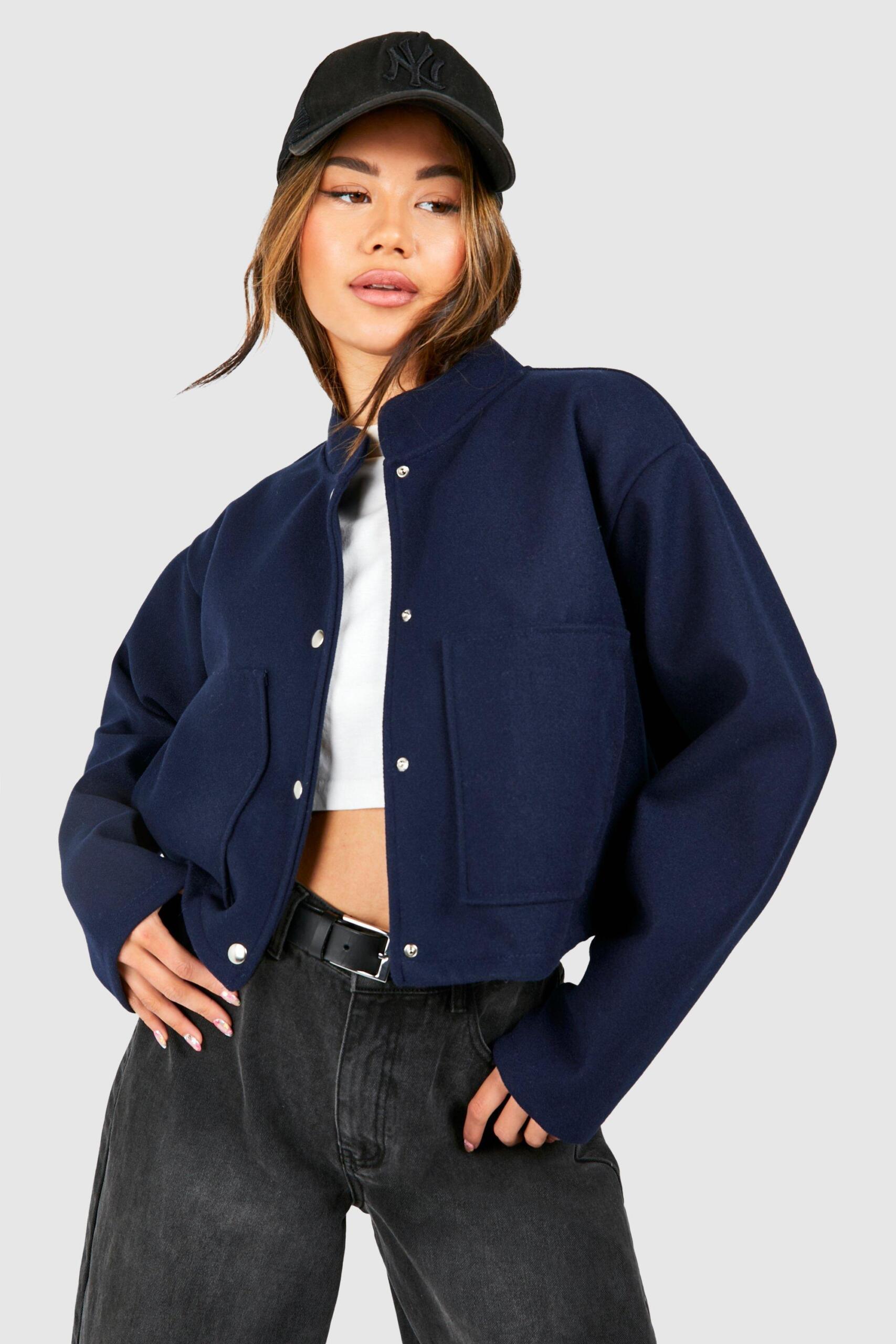 Womens Boxy Wool Look Bomber Jacket – Navy – 8 – Wrap up in the latest coats and jackets and get out-there with your outerwearBreathe life into your new season layering with the latest coats and jackets from boohoo. Supersize your silhouette in a padded jacket, stick to sporty styling with a bomber, or protect yourself from the elements in a plastic raincoat. For a more luxe layering piece, faux fur coats come in fondant shades and longline duster coats give your look an androgynous edge.