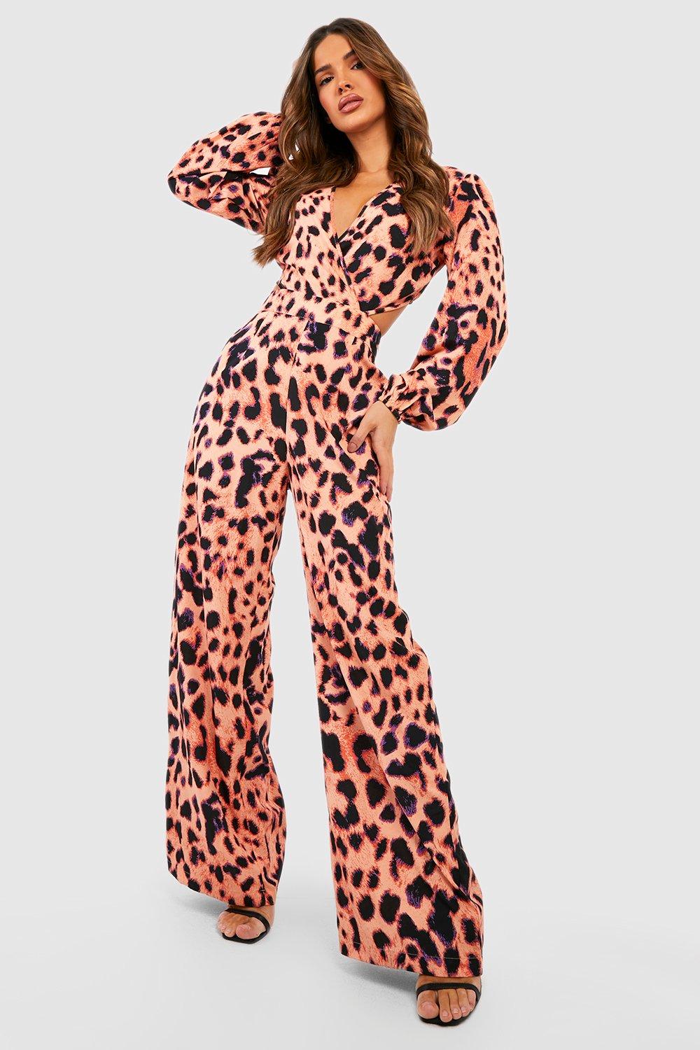Boohoo Womens Leopard Wrap Cut Out Jumpsuit