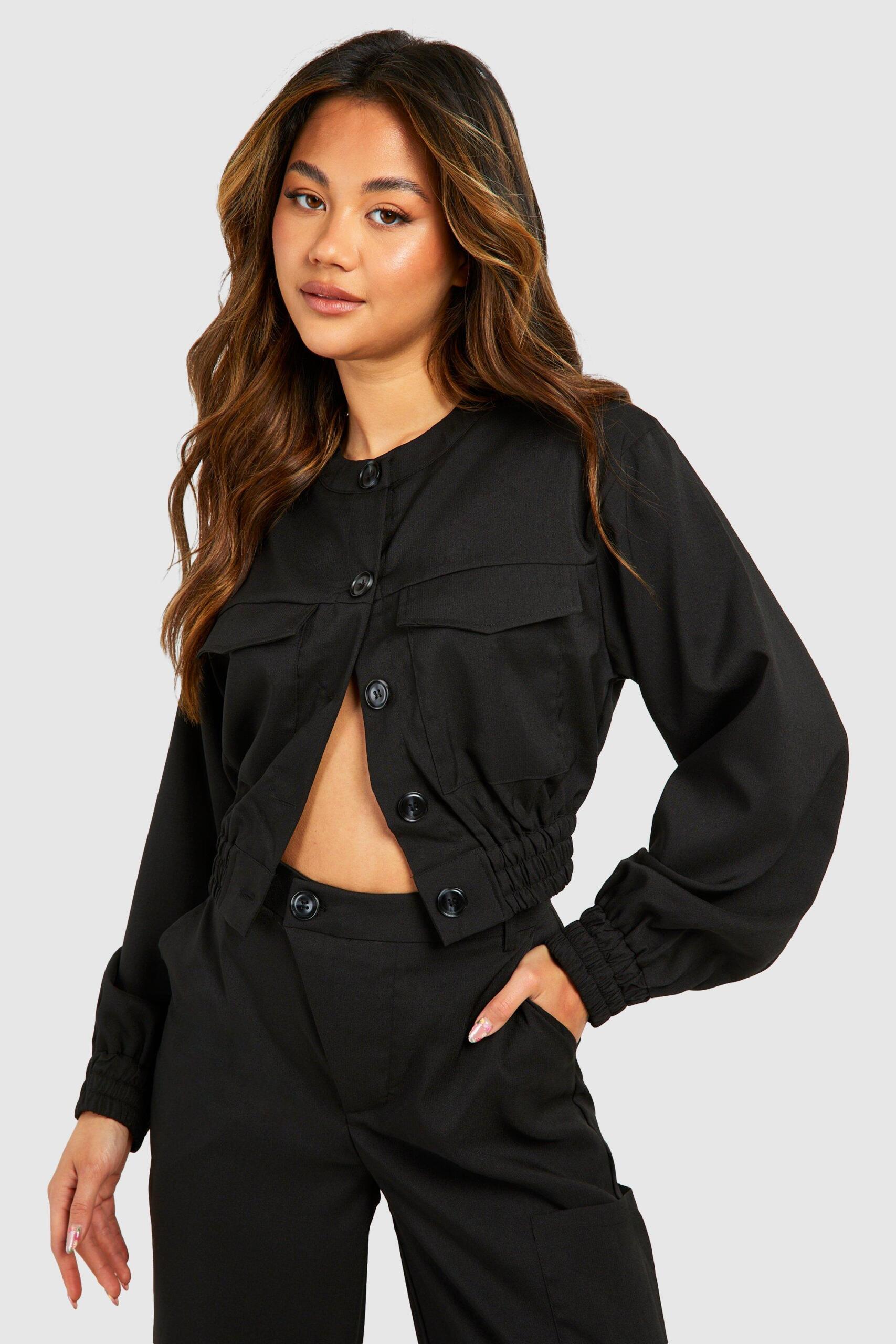 Womens Linen Look Pocket Detail Bomber Jacket – Black – 6 – Keep things casual but always on-trend with a piece of outerwear perfection, the bomber jacket. A light jacket featuring a gathered, ribbed waistband and matching cuffs, a bomber jacket is versatile, timeless, and the perfect way to edge up your casual wear. Wear your new women’s bomber jacket with a shirt and stripe joggers for the hottest look of the moment: sports luxe, or layer a varsity jacket over a t shirt dress for a fresh new-season look.Style: Bomber JacketDesign: PlainFabric: Woven CrepeLength: CroppedNeckline: CollaredSleeve Length: Long Sleeve