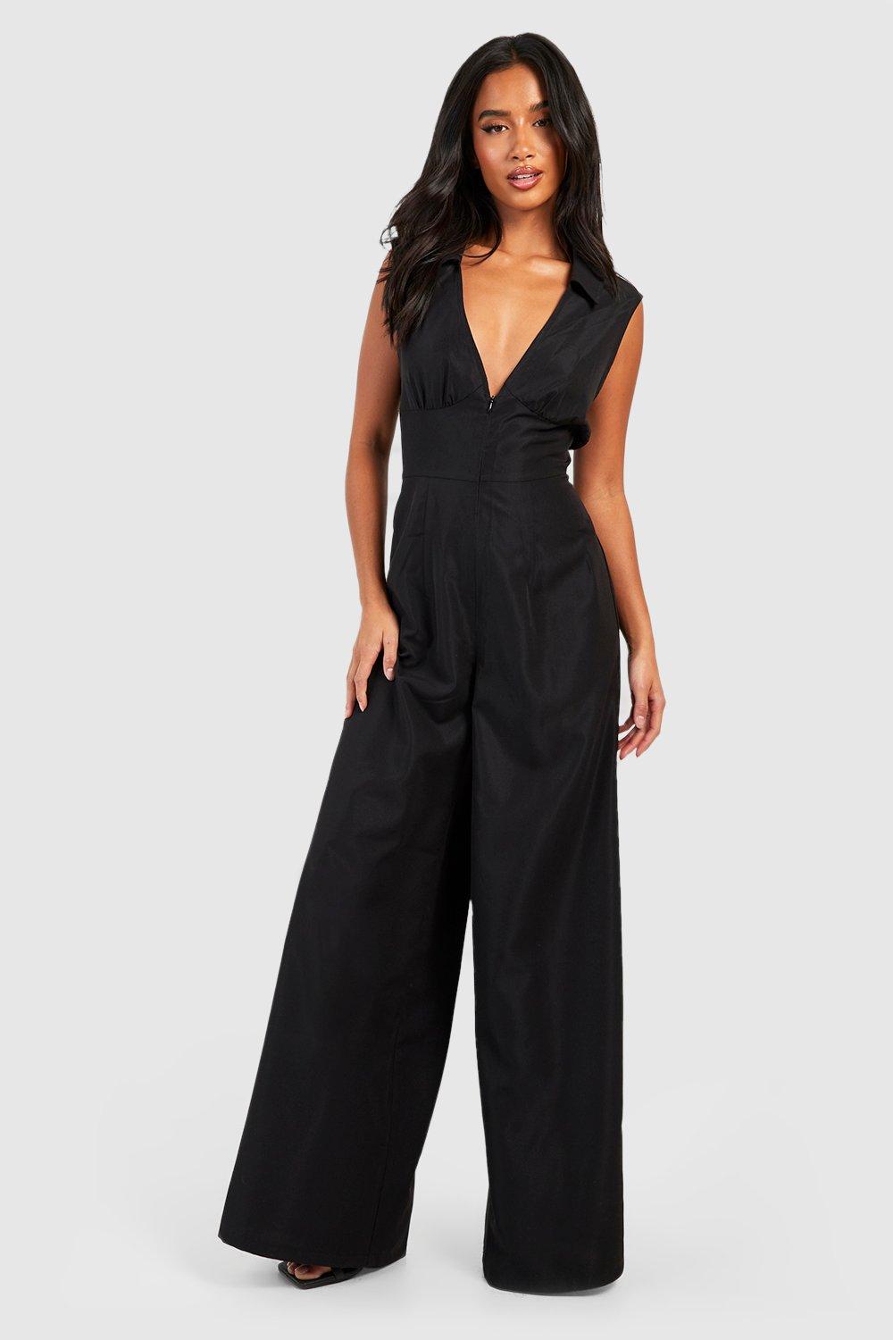 Womens Petite Zip Front Wide Leg Jumpsuit – Black – 6 – Cool, stylish, and oh-so-easy to wear, elevate your wardrobe this season with our collection of petite jumpsuits and playsuits. Designed to fit all you pocket rockets 5’3” and under, this one has been created with a slightly shorter leg to ensure the perfect fit. From petite floral playsuits to petite denim jumpsuits, boohoo has all your off-duty looks covered. Whether you’re heading out on a mate date or in-need of a picnic-appropriate piece, simply pair with sandals or chunky trainers and you’re good to go.Style: JumpsuitFabric: PolyesterLength: RegularNeckline: V NeckSleeve Length: Sleeveless