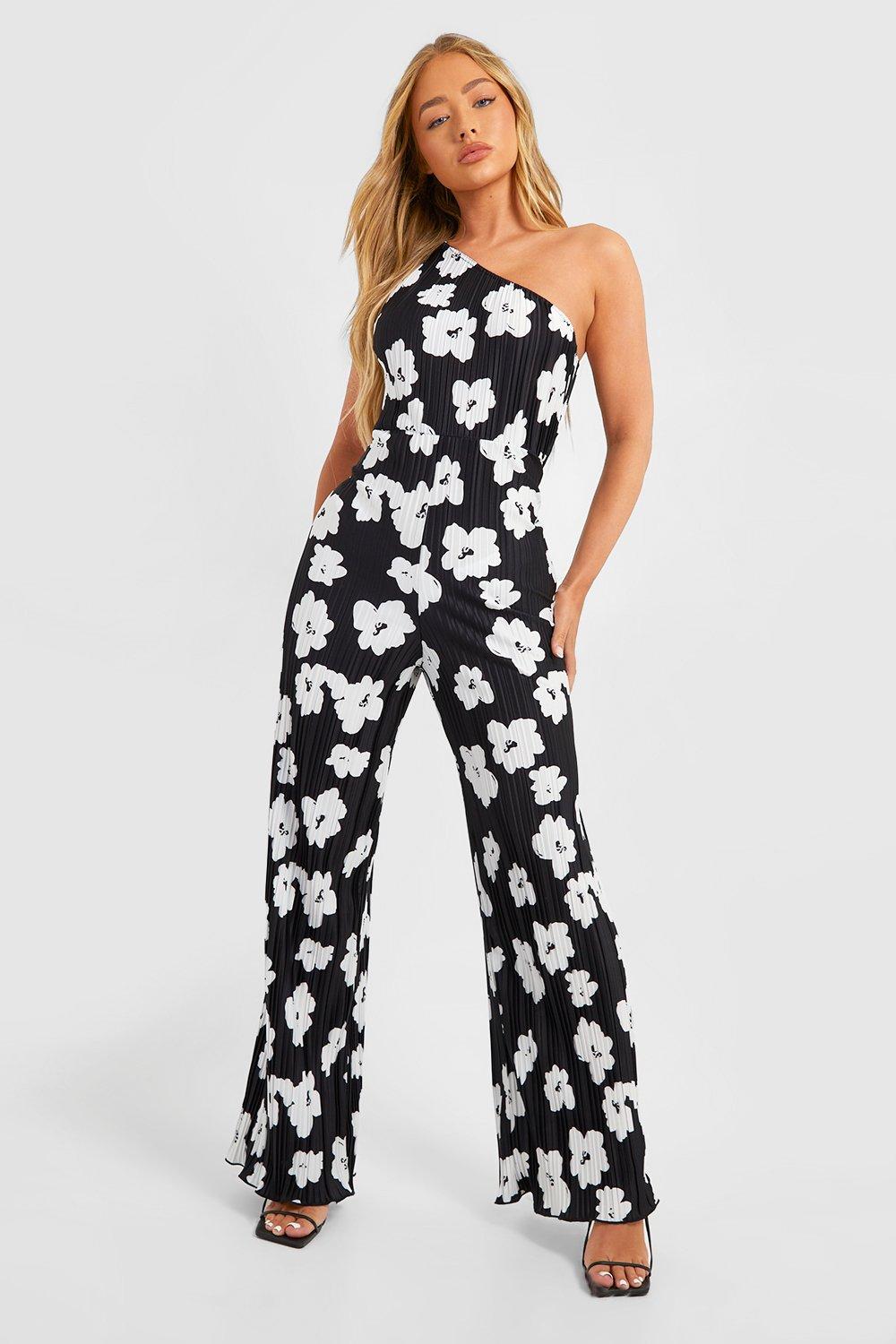 Boohoo Womens Plisse Floral Asymmetric Jumpsuit