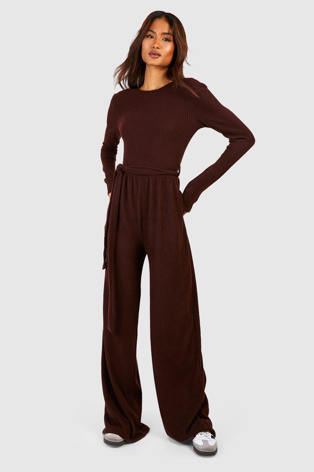 Boohoo Womens Tall Super Soft Rib Self Belt Wide Leg Jumpsuit