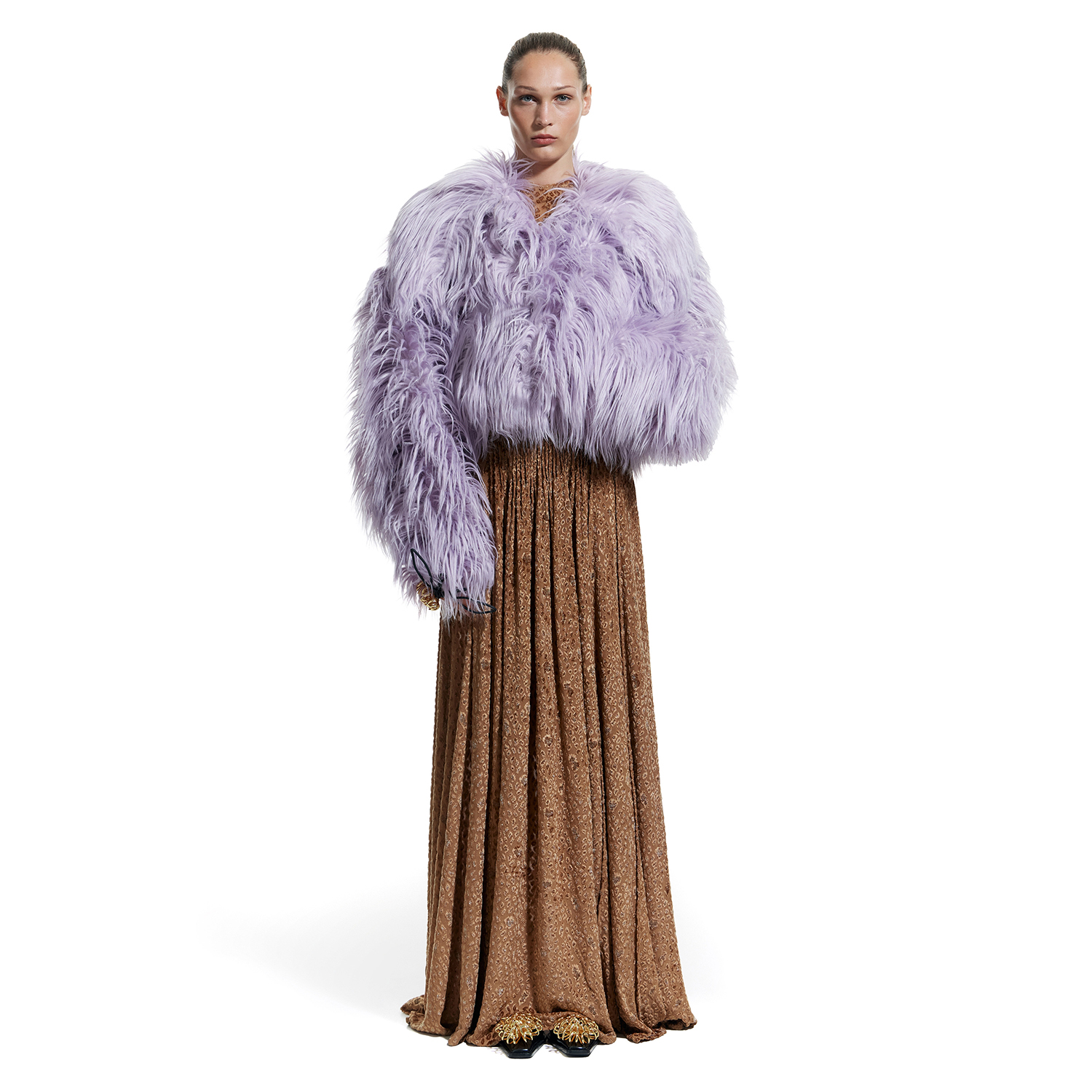Short faux fur coat in lilac. Oversize cut with maxi collar, long straight sleeve and covered front fasteners.