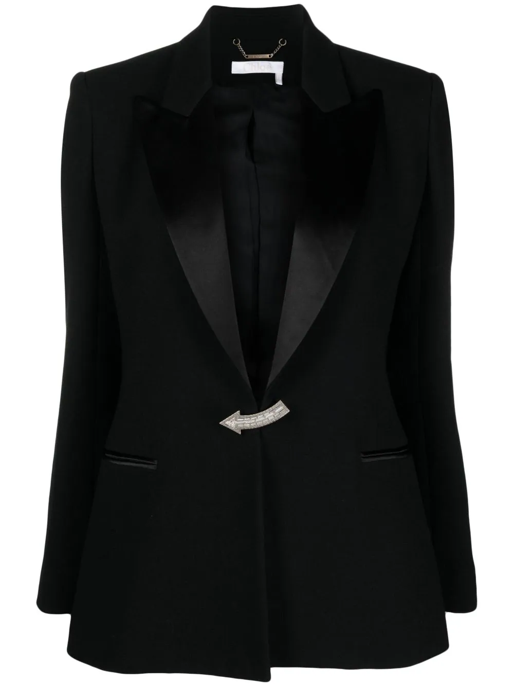 CHLOÉ Wool Tuxedo Coat Black Chloé enhances the timeless blazer design in this version crafted from virgin wool, presented in black and featuring sleek silk lapels with a luminous crystal brooch securing the front. HIGHLIGHTS Pure wool Crystal-adorned brooch accent Metallic silver accents Glossy satin insets Pointed lapels Pin securing Shoulder pads Long sleeves Buttoned cuffs Two side welt pockets Cotton-silk blend lining American rear vent Straight hem COMPOSITION Lining: Viscose 90%, Cotton 61%, Silk 39%, Wool 10% Outer: Virgin Wool 100% Product ID: C24SVE06068-001 Season: PS24 Collection