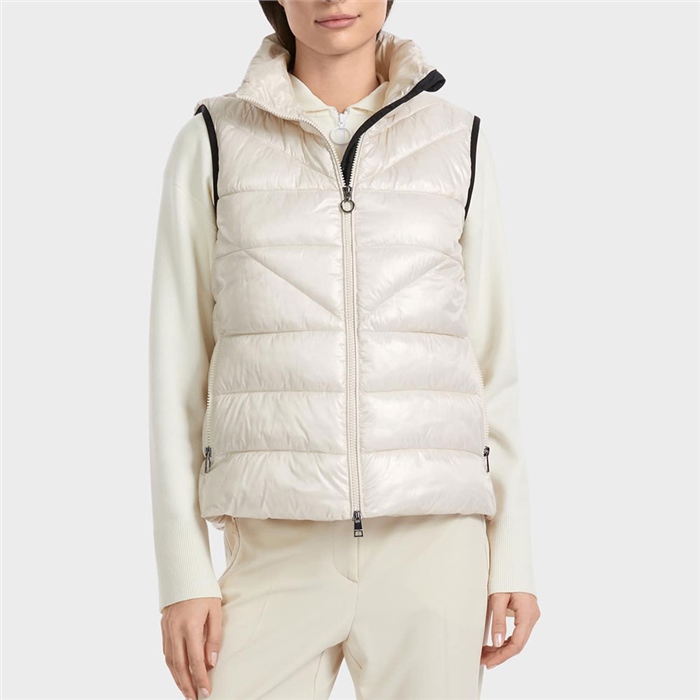 Introducing the stylish and modern Padded Gilet by Marc Cain. This sleeveless gilet is the perfect addition to your wardrobe, offering both warmth and style. With its high closing collar and central two-way zip fastening, this gilet is not only practical but also fashion-forward.