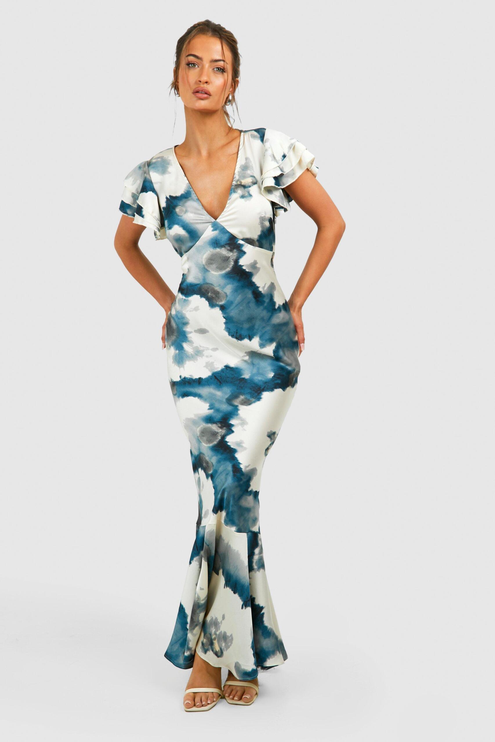Womens Abstract Satin Ruffle Sleeve Maxi Dress – Blue – 8 – Abstract Satin Ruffle Sleeve Maxi Dress