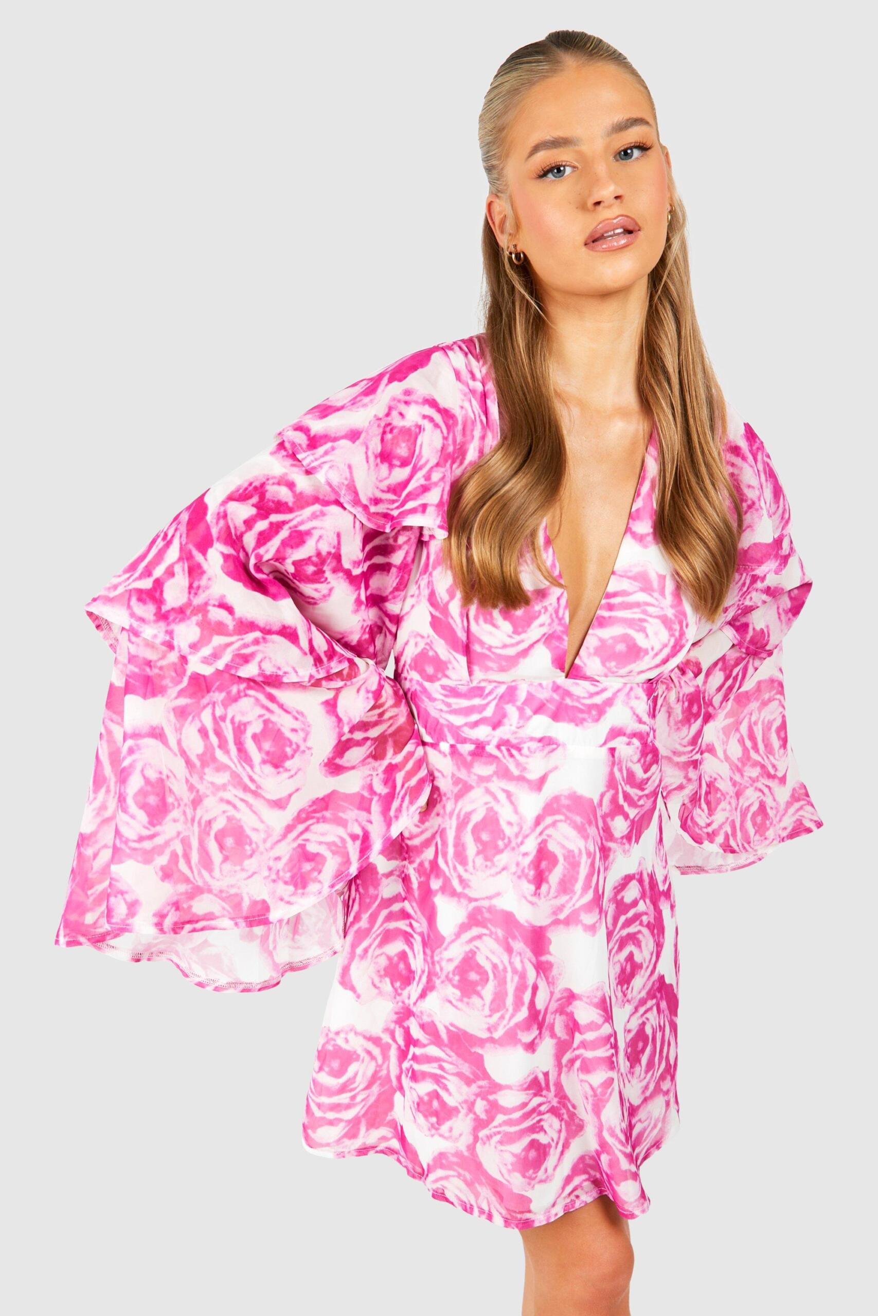 Womens Floral Chiffon Layered Frill Sleeve Skater Dress – Pink – 8 – Floral Chiffon Layered Frill Sleeve Skater Dress