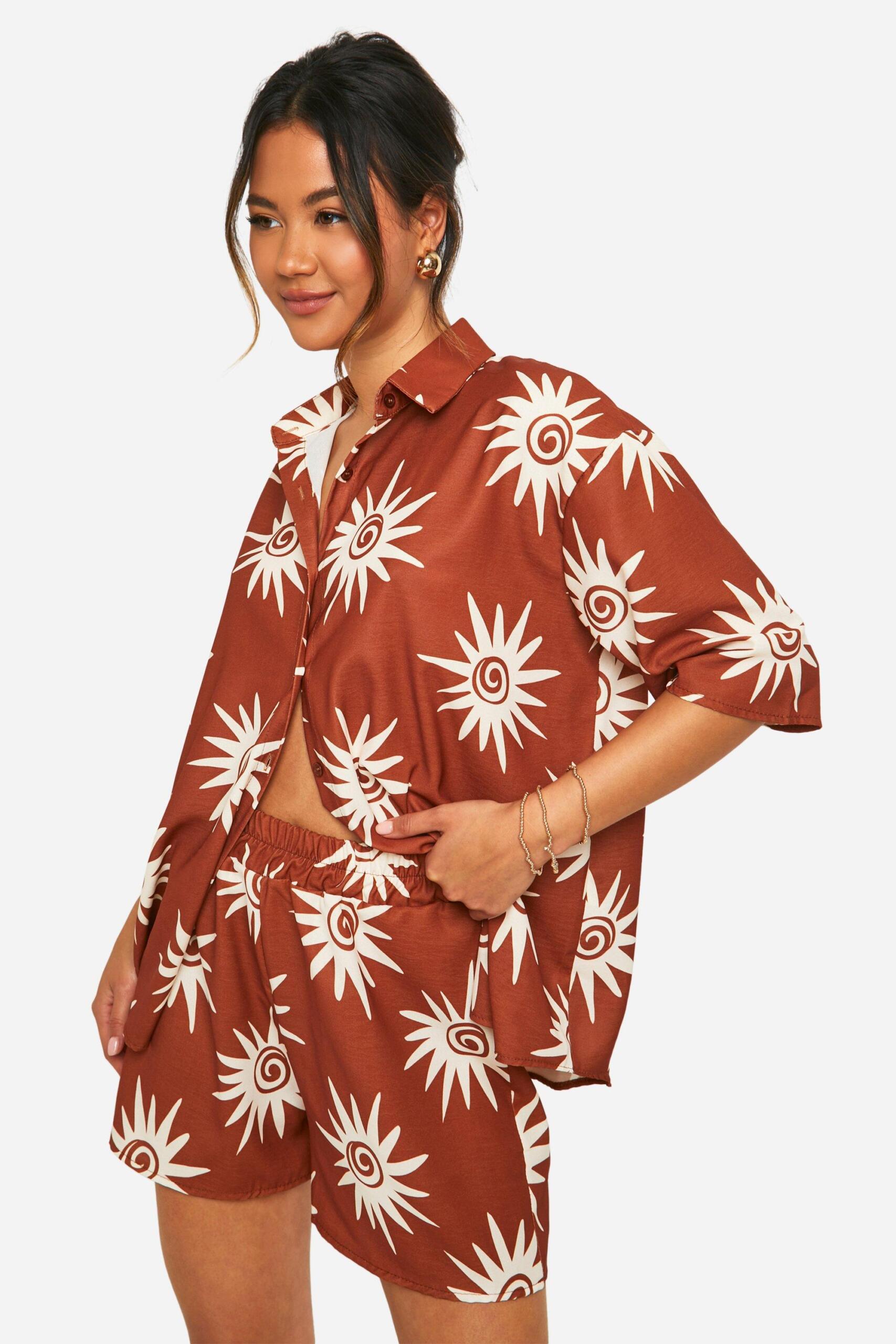 Boohoo Womens Hammered Tonal Sun Print Oversized Shirt & Shorts Set