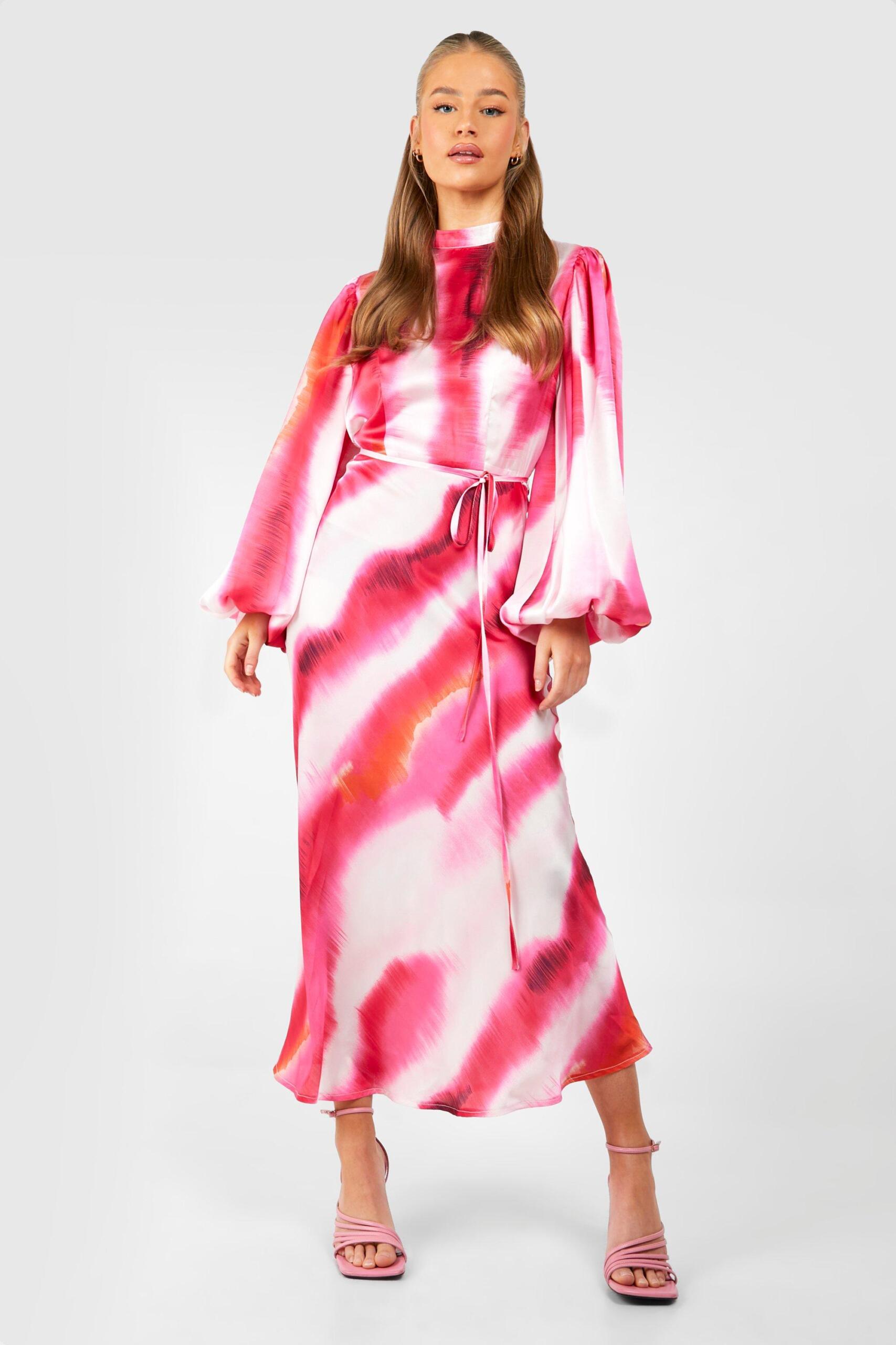 Womens Marble Print Satin Long Sleeve Midi Dress – Pink – 8 – Marble Print Satin Long Sleeve Midi Dress