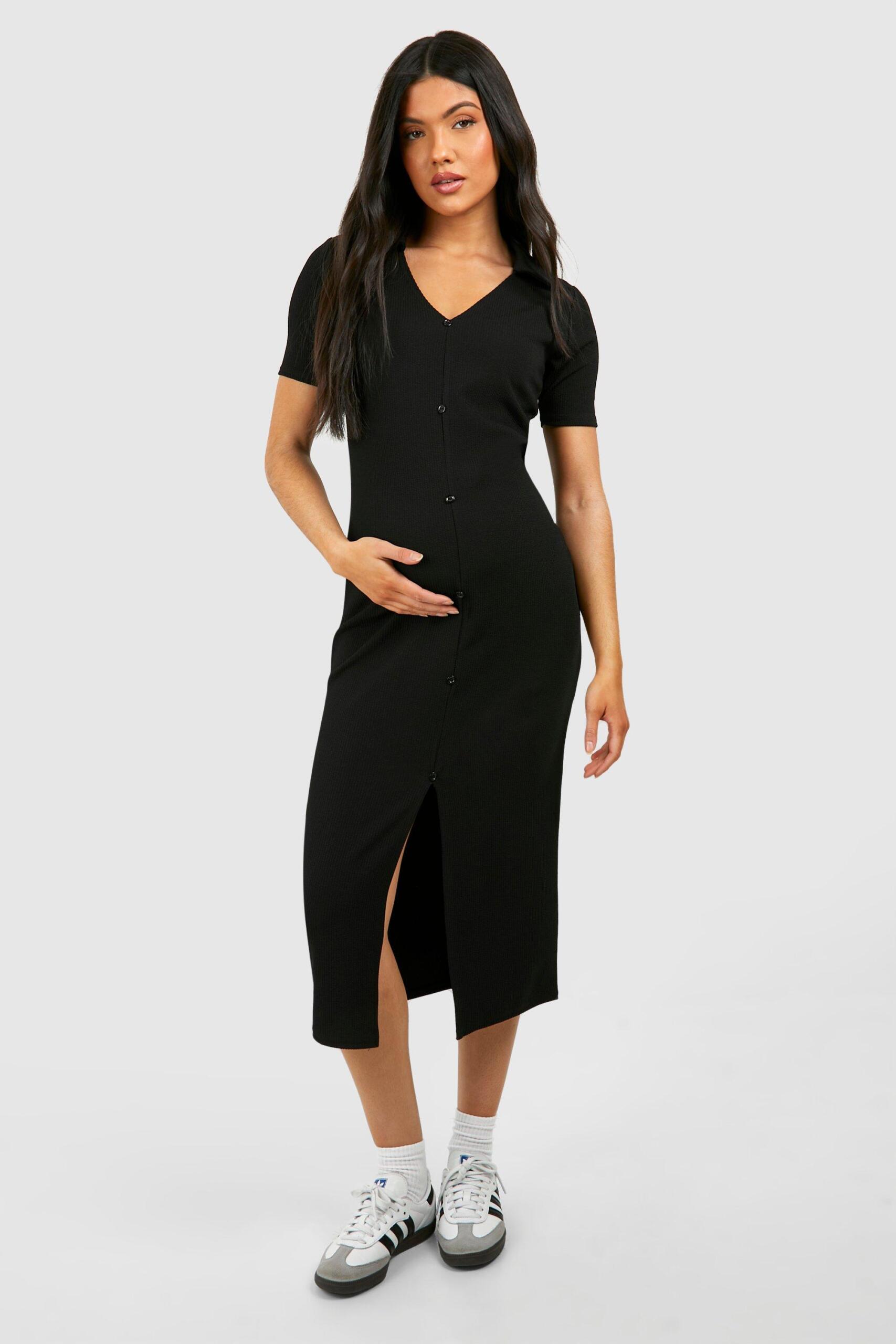 Boohoo Womens Maternity Textured Rib Collard Button Down Midi Dress