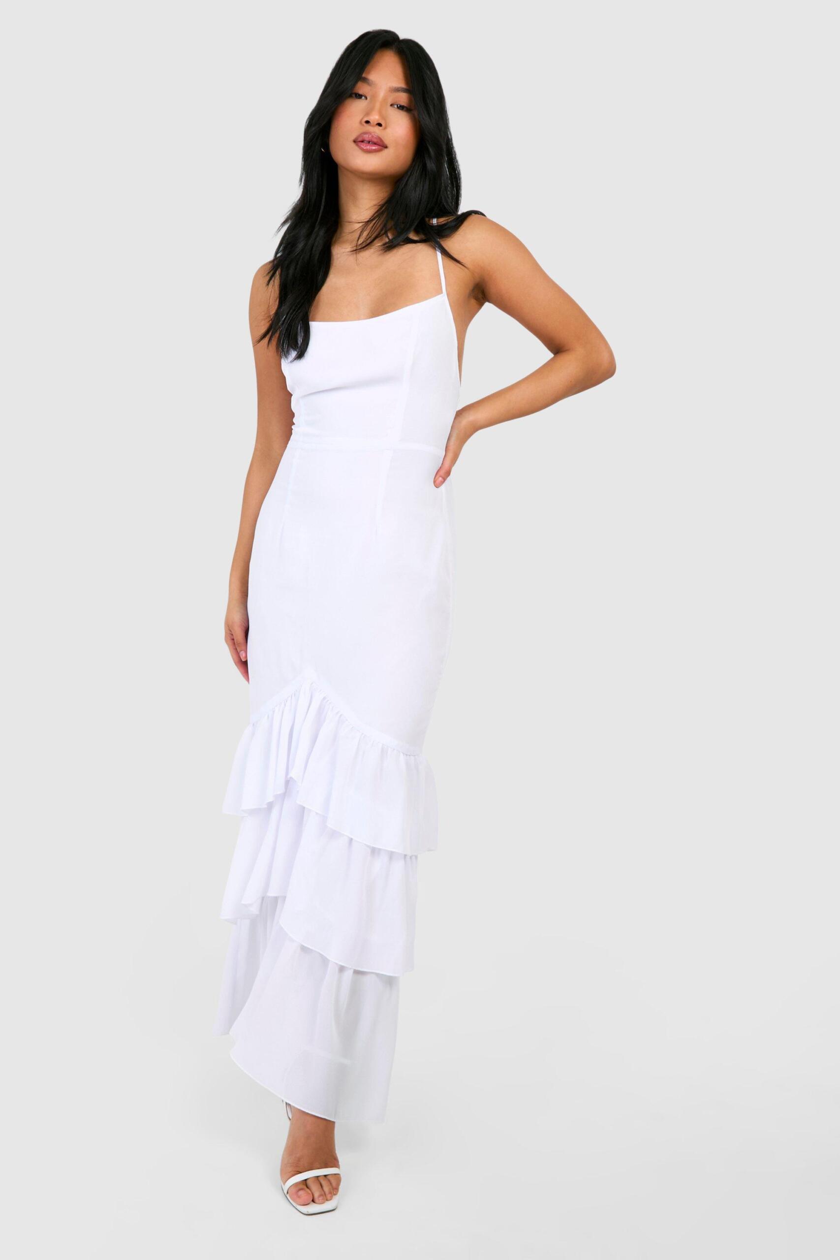 Womens Petite Chiffon Ruffle Strappy Maxi Dress – white – 6 – Specifically designed to fit those 5’3” and under, boohoo’s range of petite maxi dresses is here to elevate your wardrobe this season. From floral designs to daring thigh splits, our collection of petite long dresses has you covered. Whether you’re heading abroad or enjoying a staycation, just pair with barely-there heels and a cute clutch and get ready to turn some serious heads. PSA: if you’re feeling more casual, this one would look just as good with chunky trainers and an oversized beach bag.Style: Maxi DressFabric: WovenLength: MaxiNeckline: StrappySleeve Length: Sleeveless