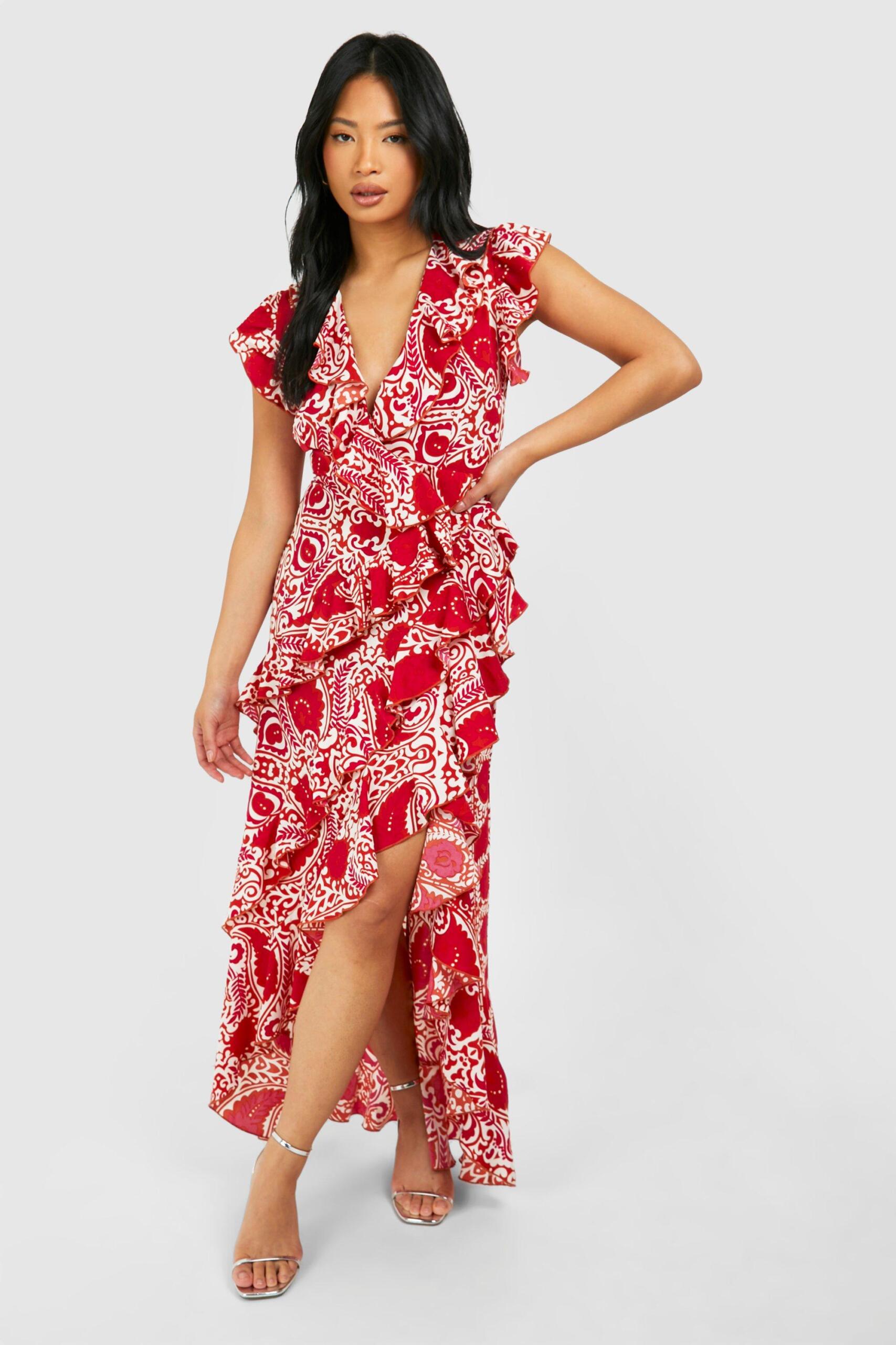 Womens Petite Tile Print Wrap Ruffle Maxi Dress – orange – 6 – Specifically designed to fit those 5’3” and under, boohoo’s range of petite maxi dresses is here to elevate your wardrobe this season. From floral designs to daring thigh splits, our collection of petite long dresses has you covered. Whether you’re heading abroad or enjoying a staycation, just pair with barely-there heels and a cute clutch and get ready to turn some serious heads. PSA: if you’re feeling more casual, this one would look just as good with chunky trainers and an oversized beach bag.Style: Maxi DressFabric: WovenLength: MaxiSleeve Length: Sleeveless