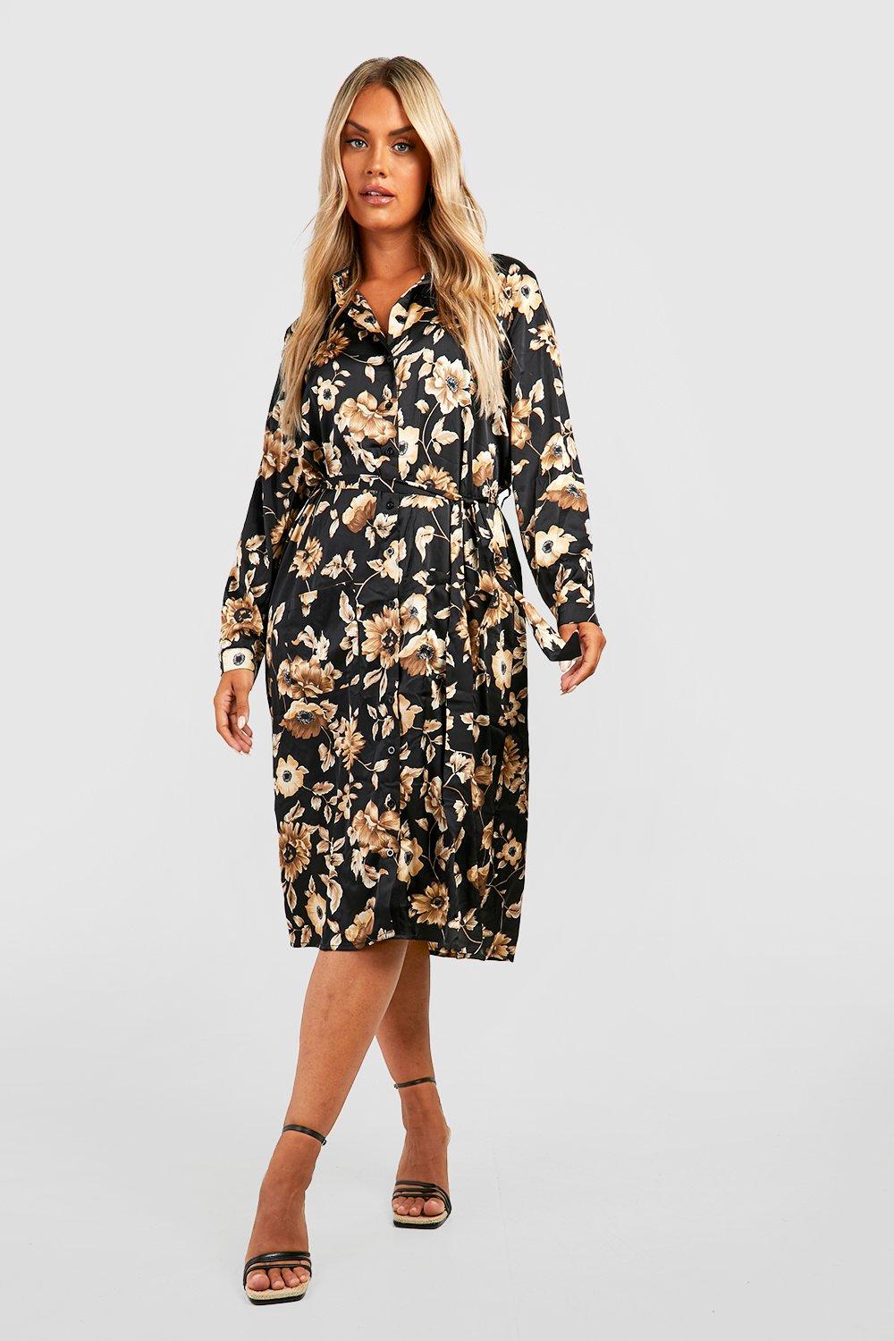 Boohoo Womens Plus Dark Floral Printed Tie Belt Shirt Dress