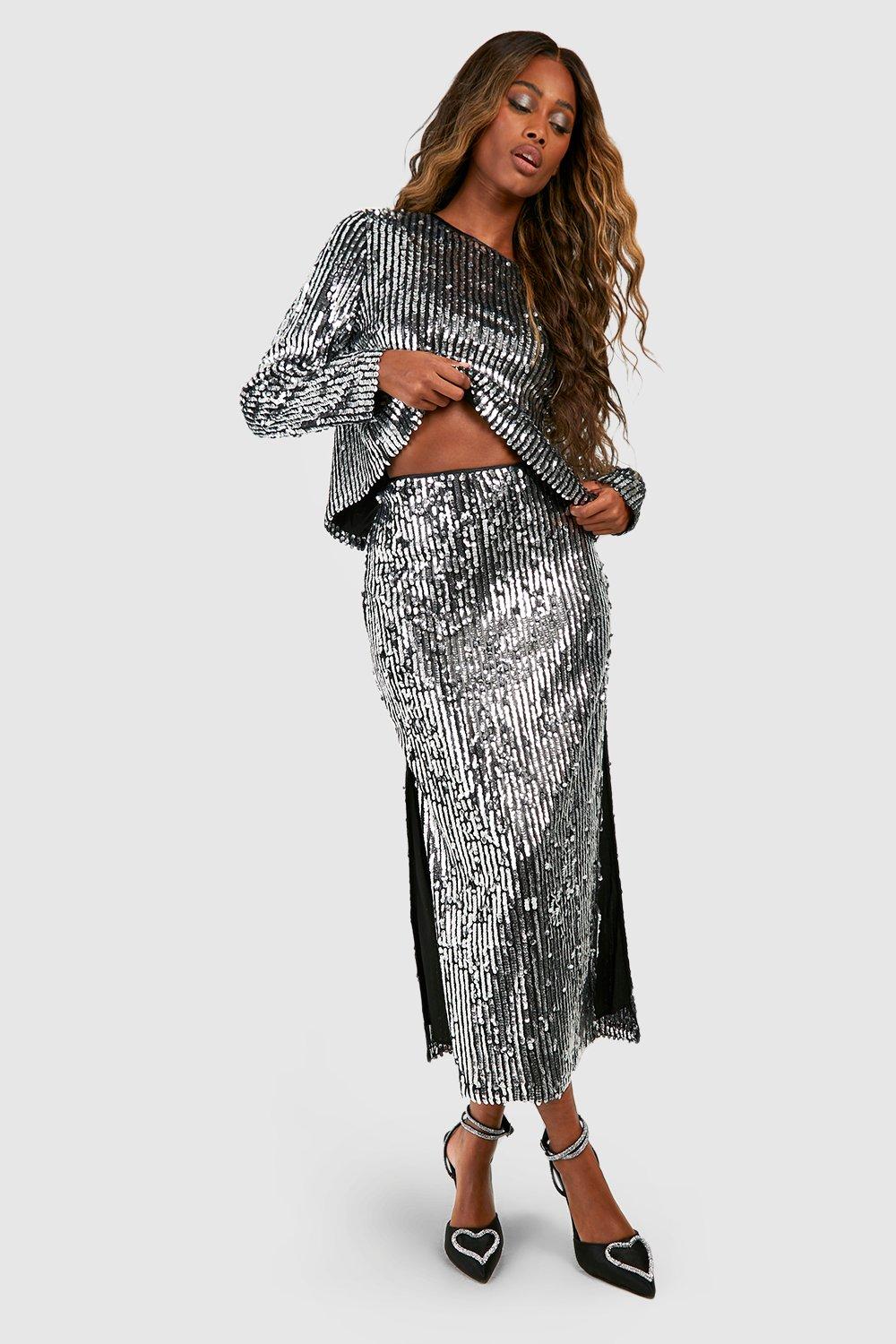 Boohoo Womens Premium Sequin Stripe Split Side Midaxi Skirt