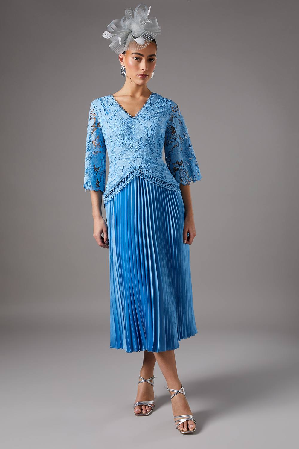 Exquisite lace bodice with intricate floral pattern Elegant V-neckline for a flattering silhouette Three-quarter length sleeves with scalloped edges Pleated midi skirt for graceful movement Contrasting textures between lace top and pleated bottom This stunning Coast dress radiates sophistication and charm, perfect for those special occasions where you want to make a lasting impression. The delicate lace bodice, adorned with an intricate floral pattern, creates a captivating visual interest while the V-neckline elongates the neck and enhances your dcolletage. The three-quarter length sleeves offer a touch of modesty and feature scalloped edges for an extra dose of elegance. The pleated midi skirt adds a beautiful contrast in texture and ensures graceful movement as you glide across the room. Ideal for weddings, race days, or formal garden parties, this dress can be styled with a statement fascinator, as shown, and metallic strappy sandals for a polished ensemble. Add a clutch bag and delicate drop earrings to complete your sophisticated look.