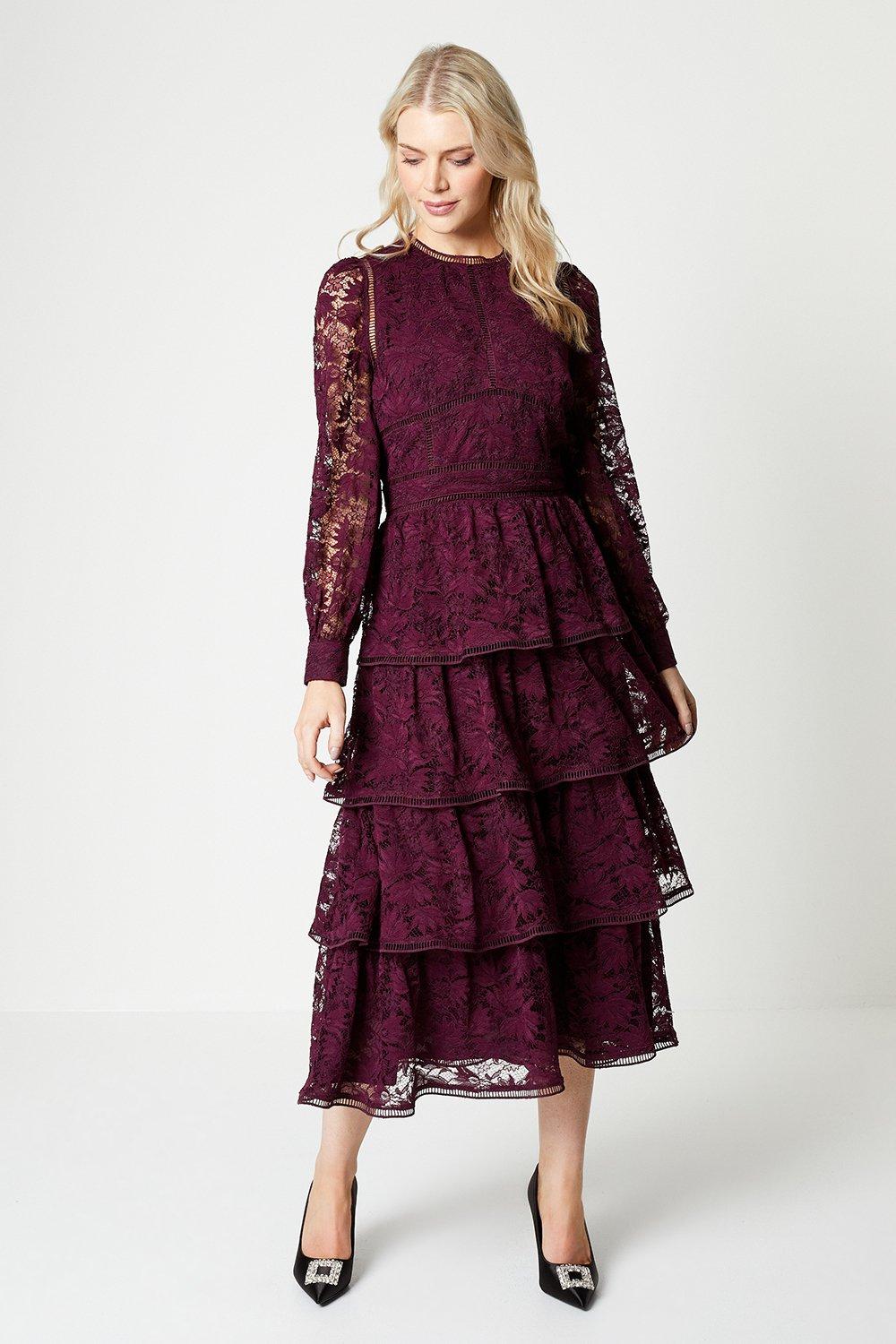 Dorothy Perkins Womens Tiered Lace Dress With Long Sleeve