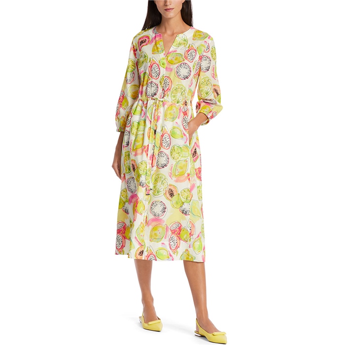 Dress with citrus print by Marc Cain This dress with citrus print by Marc Cain is stylish and effortlessly feminine. It is a knee length dress featuring a v-neck and 3/4 sleeves with elasticated cuffs and a drawstring waist for enhanced shap ….