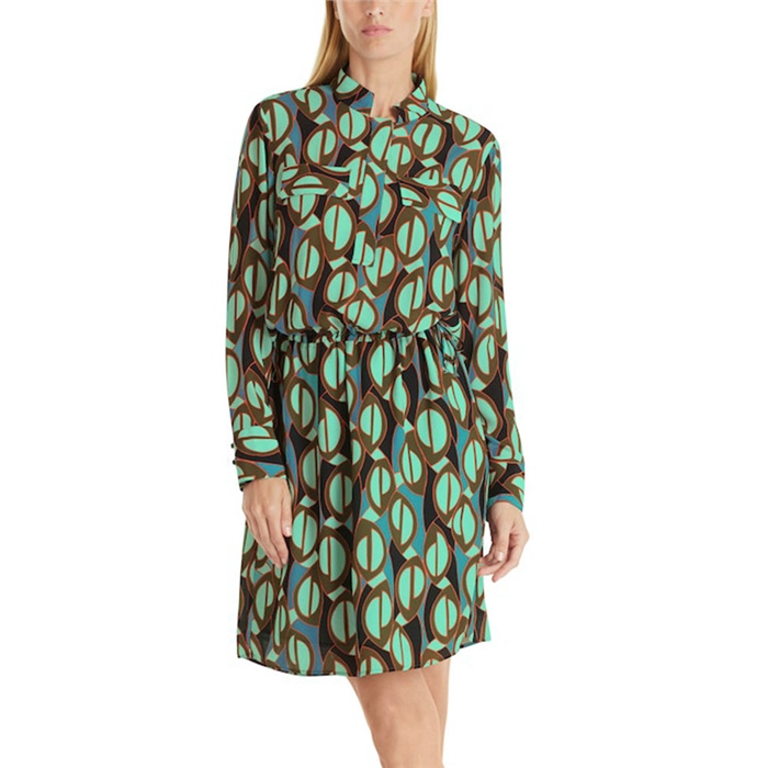 Dress with geometric print by Marc Cain This dress with geometric print by Marc Cain is stylish and effortlessly feminine. It is a knee length dress which features a slightly stand up collar and breast pockets. It has long sleeves with butto ….