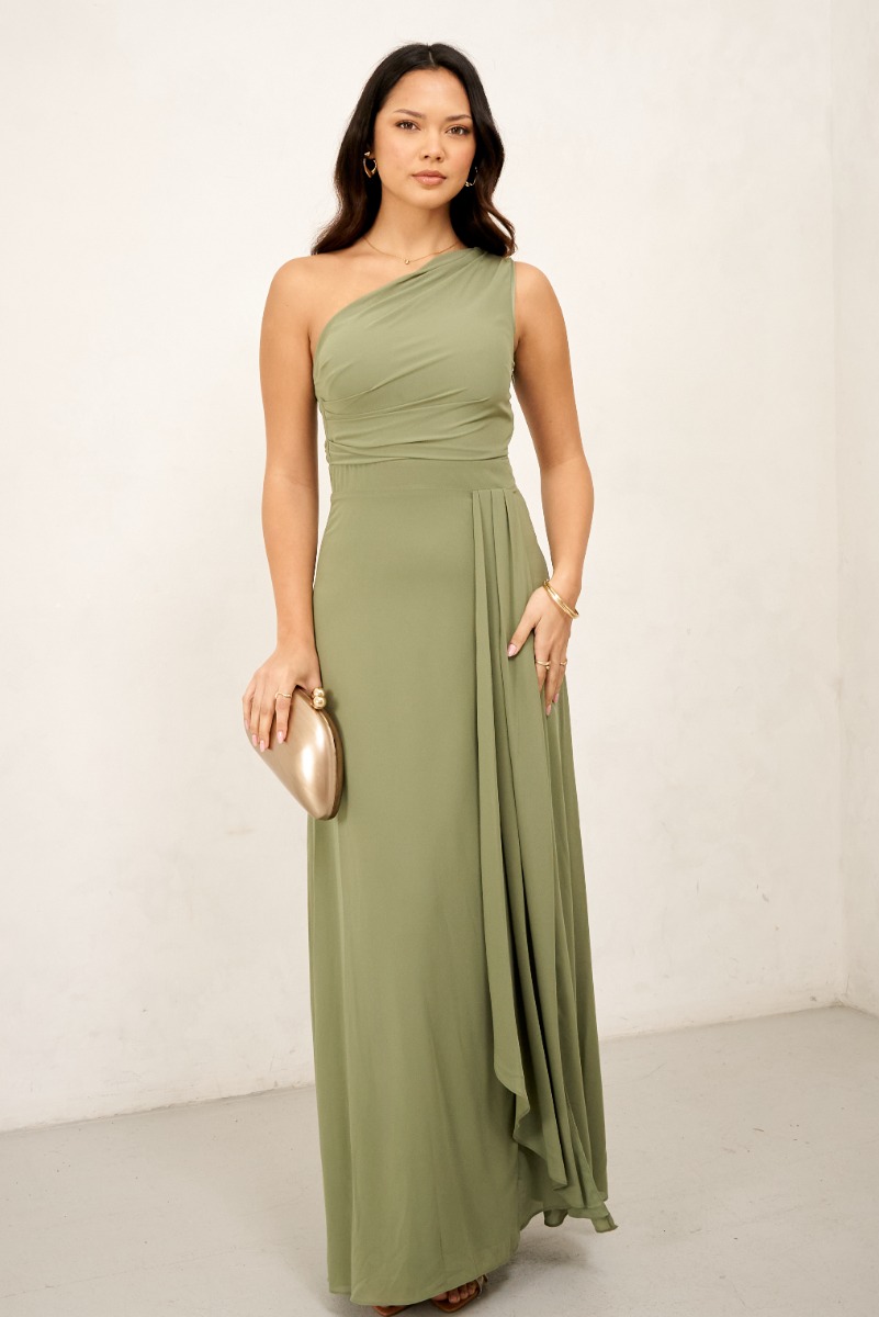 TFNC Occasion Dress – One Shoulder – Frilled Detailed Skirt – Thigh High Slit – Maxi length Material: 100% Polyester. Care: Hand wash only