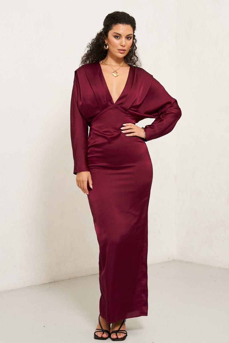 TFNC Occasion Dress – Deep V Top – Satin Finish – Long Sleeve – Maxi Length Material: 100% Polyester. Care: Hand wash only Model is 5’8 Model wears a size 8 UK