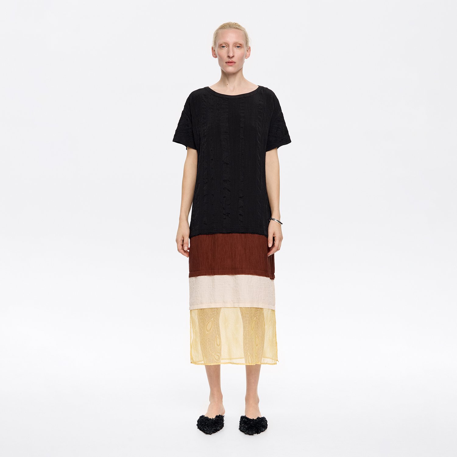 Dress Midi length Crew neck Short sleeve Three-tone contrast hem