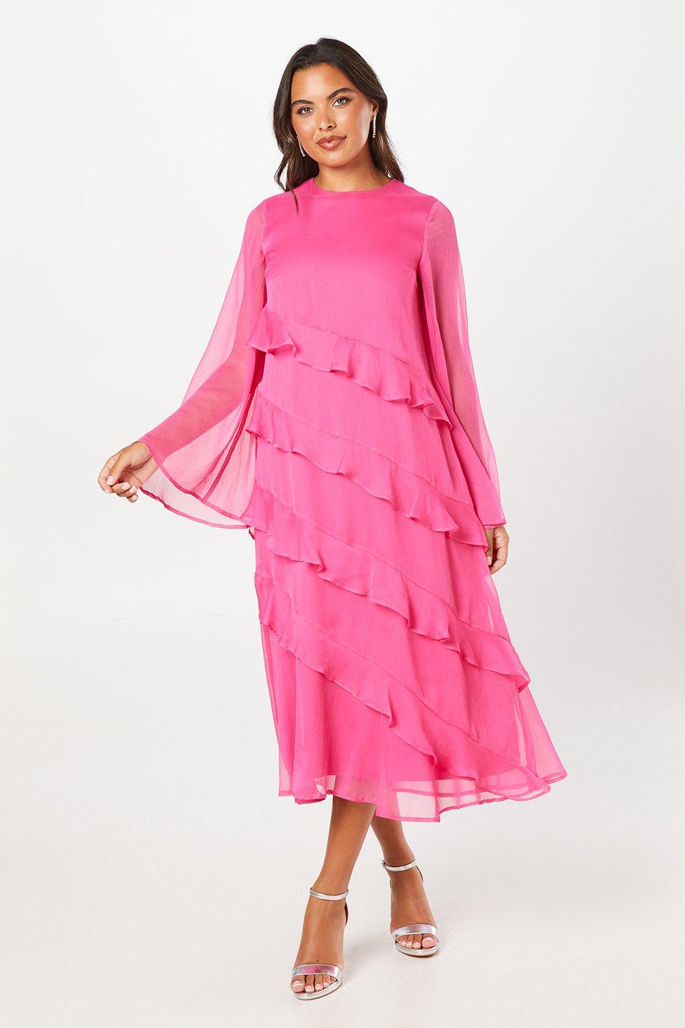 Ethereal Chiffon Midi Dress With Cascading Ruffle Tiers Elegant Crew Neckline For A Sophisticated Look Voluminous Long Sleeves With Dramatic Bell Cuffs Lightweight Fabric Perfect For Graceful Movement Versatile Midi Length Suitable For Various Occasions Make A Statement At Your Next Special Event With This Enchanting Chiffon Midi Dress From Coast. The Cascading Ruffle Tiers Create A Captivating Silhouette That’S Sure To Turn Heads, While The Lightweight Fabric Ensures Comfort And Ease Of Movement Throughout The Day. Perfect For Weddings, Race Days, Or Formal Gatherings, This Dress Can Be Styled To Suit A Variety Of Occasions. Pair With Strappy Metallic Heels And A Clutch Bag For A Classic Look, Or Add Statement Earrings And An Updo For Extra Glamour. The Versatile Midi Length And Long Sleeves Make This Piece Suitable For Both Daytime And Evening Events, Allowing You To Transition Effortlessly From A Garden Party To An Evening Reception. Embrace Your Feminine Side And Radiate Confidence In This Beautifully Crafted Coast Creation.