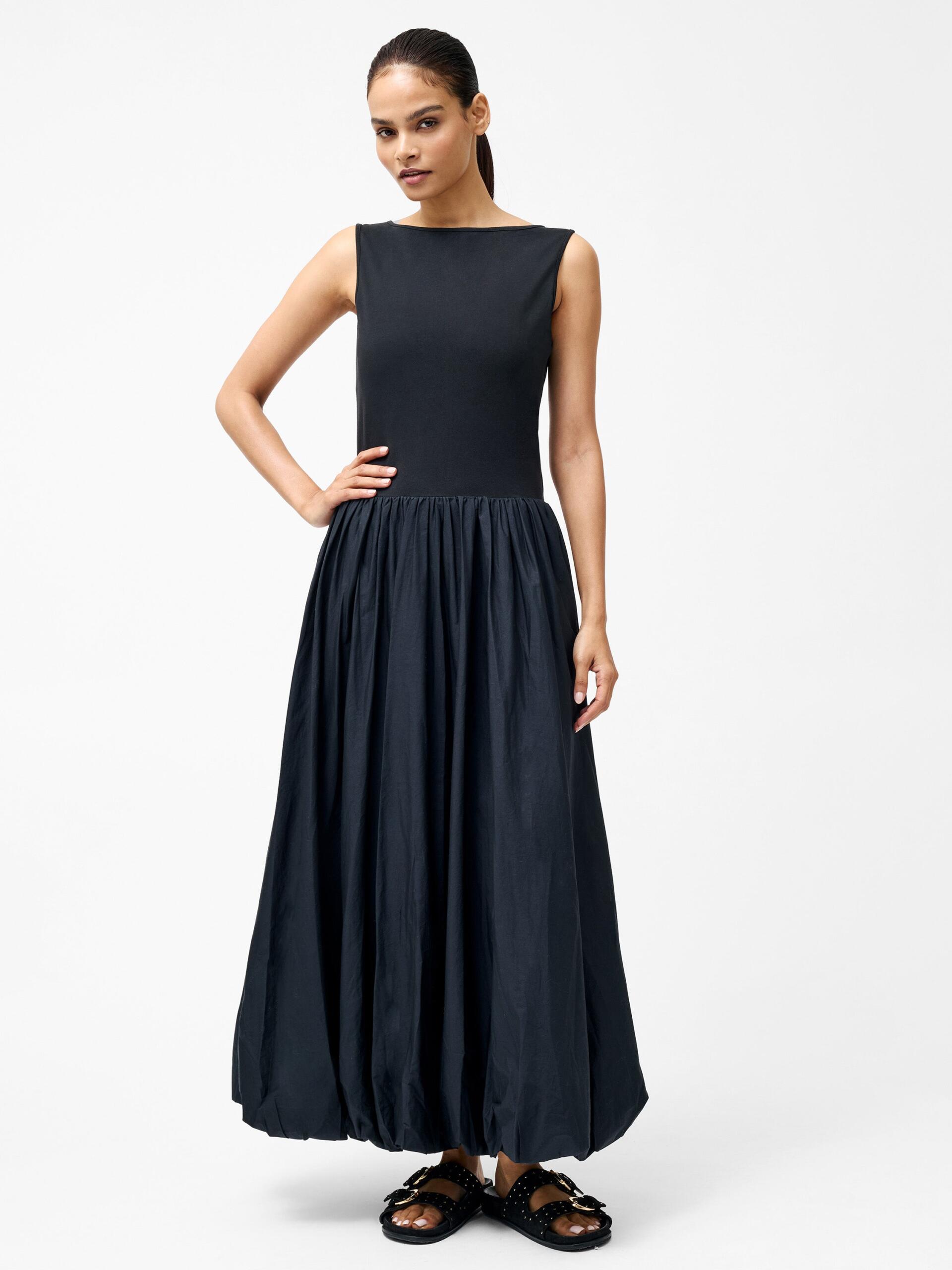 Twirl into timeless drama with our Phoebe Jersey Bubble Hem Midi Dress. This black midi dress presents its sleeveless silhouette with a boat neck bodice and full flattering bubble hem skirt. Dress Fabric: soft, smooth bodice, black Sleeveless Boat neckline Bubble hem Lined Midi length Size S length is 134cm Our model is 5ft7.5″ and wearing a Size S Style code – 71YIE
