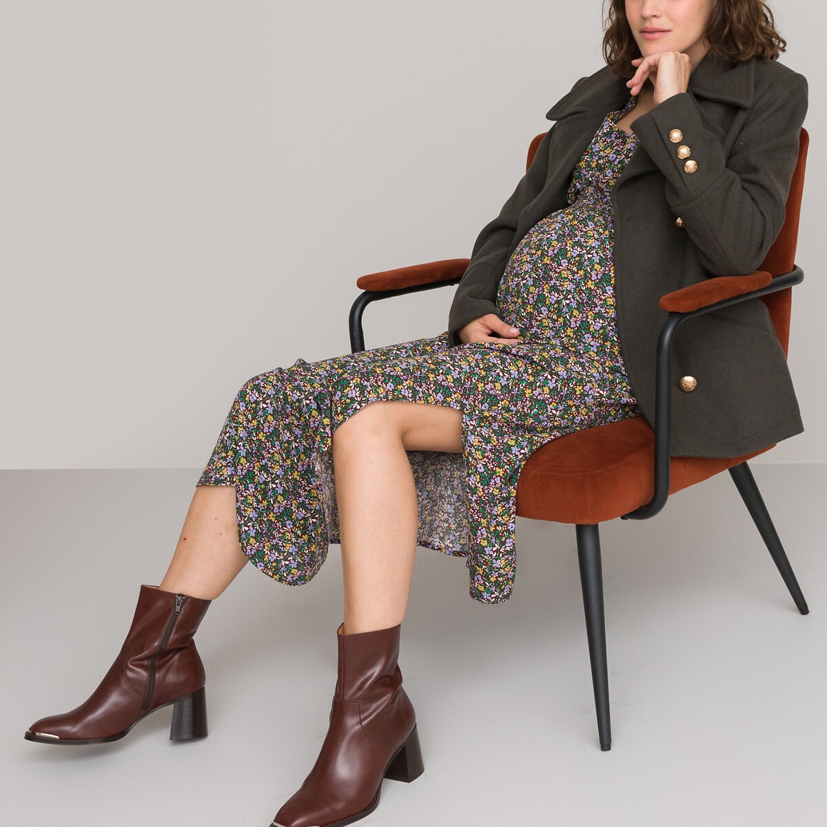 The La Redoute Collections Floral Maternity Midi Dress with Smocked Details is a head-turning dress that will bring out your feminine side. Perfect for expecting moms, this dress features a flattering v-neckline, long sleeves with shirred cuffs, and smocked details that provide freedom of movement to accommodate a growing belly. This midi-length dress also boasts a beautiful floral print that adds a romantic touch to your maternity wardrobe.
