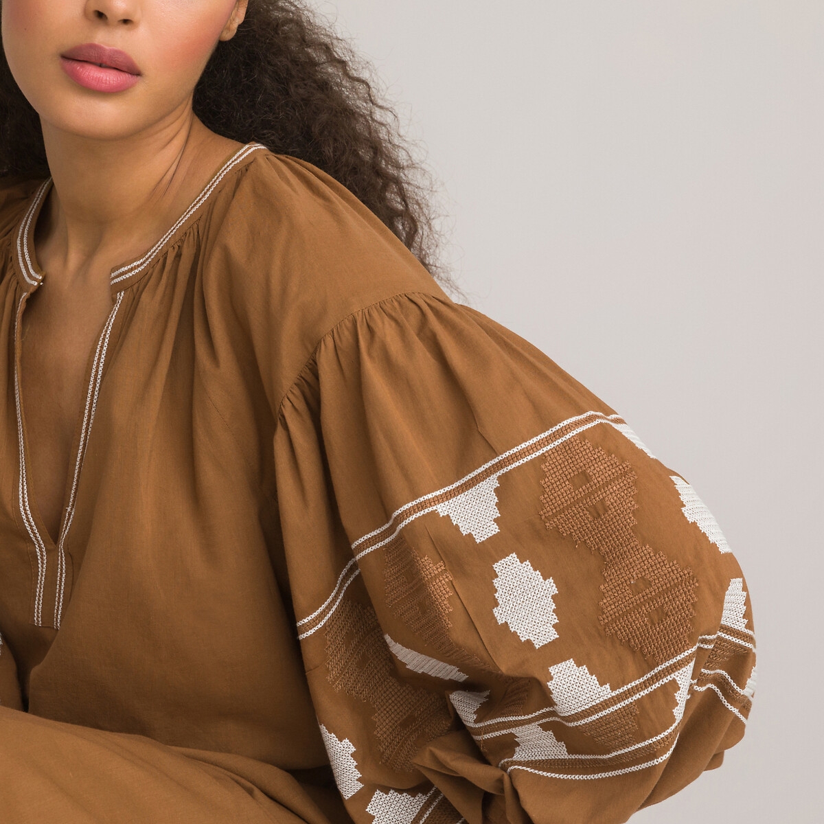 Make a statement this summer with La Redoute Collections Printed Cotton Midi Dress with 3/4 Length Balloon Sleeves and Jellabah Neck. This dress is designed with a jellabah neckline and embroidery on the balloon sleeves to give you an effortlessly chic look. Made with 100% cotton, this dress is perfect for keeping you cool and comfortable in the summer heat.