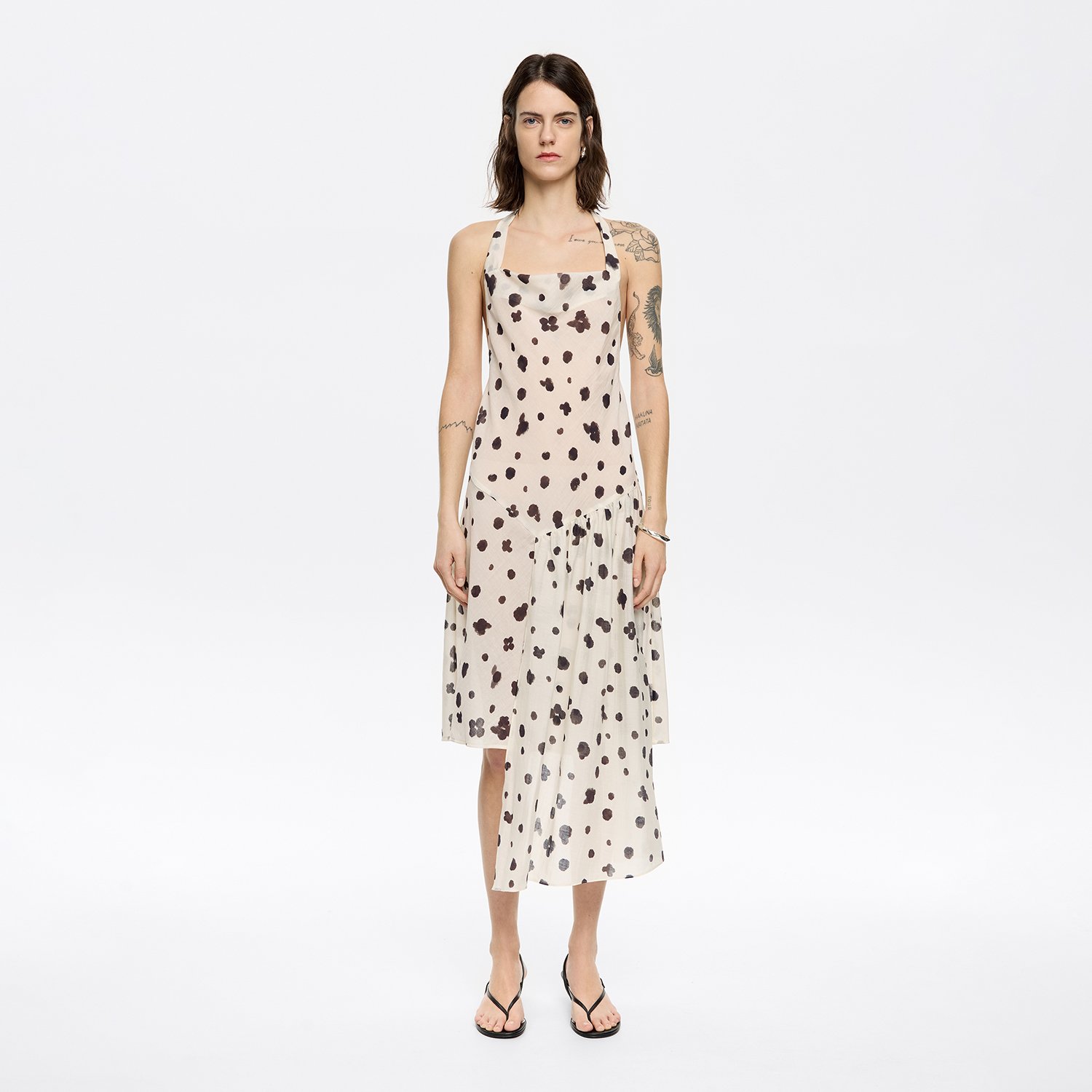 Mini dress in ivory with Graindots print. Draped design with tie at the neck, plunging back and asymmetric ruffle at the hip.