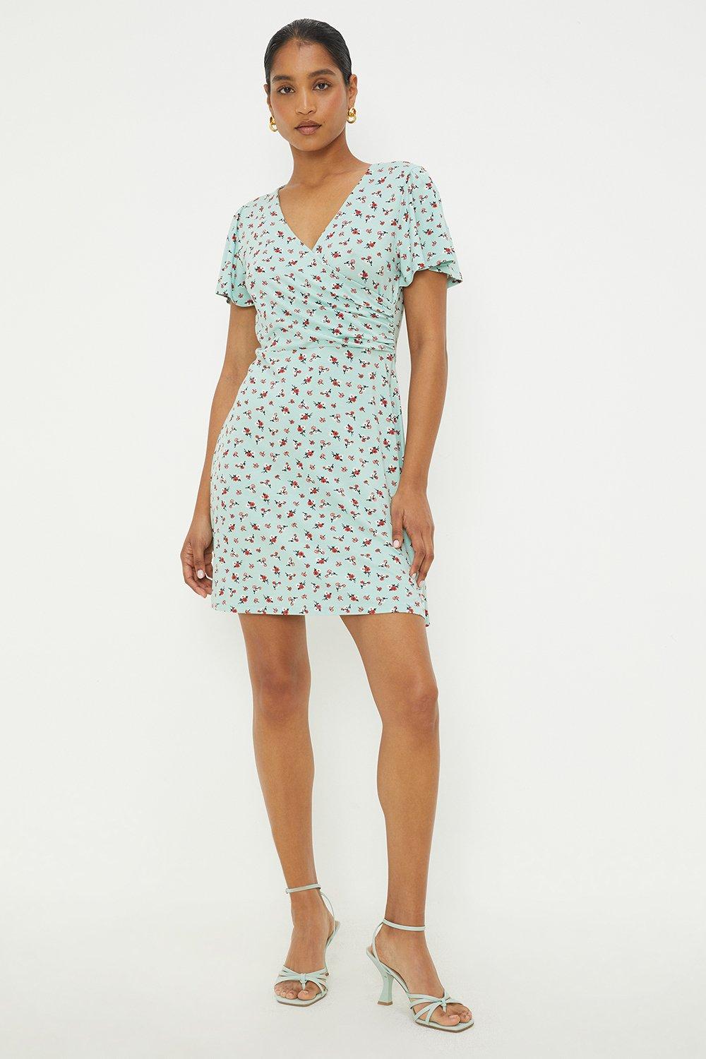 Dorothy Perkins Womens Green Ditsy Flutter Sleeve Wrap Mini Dress