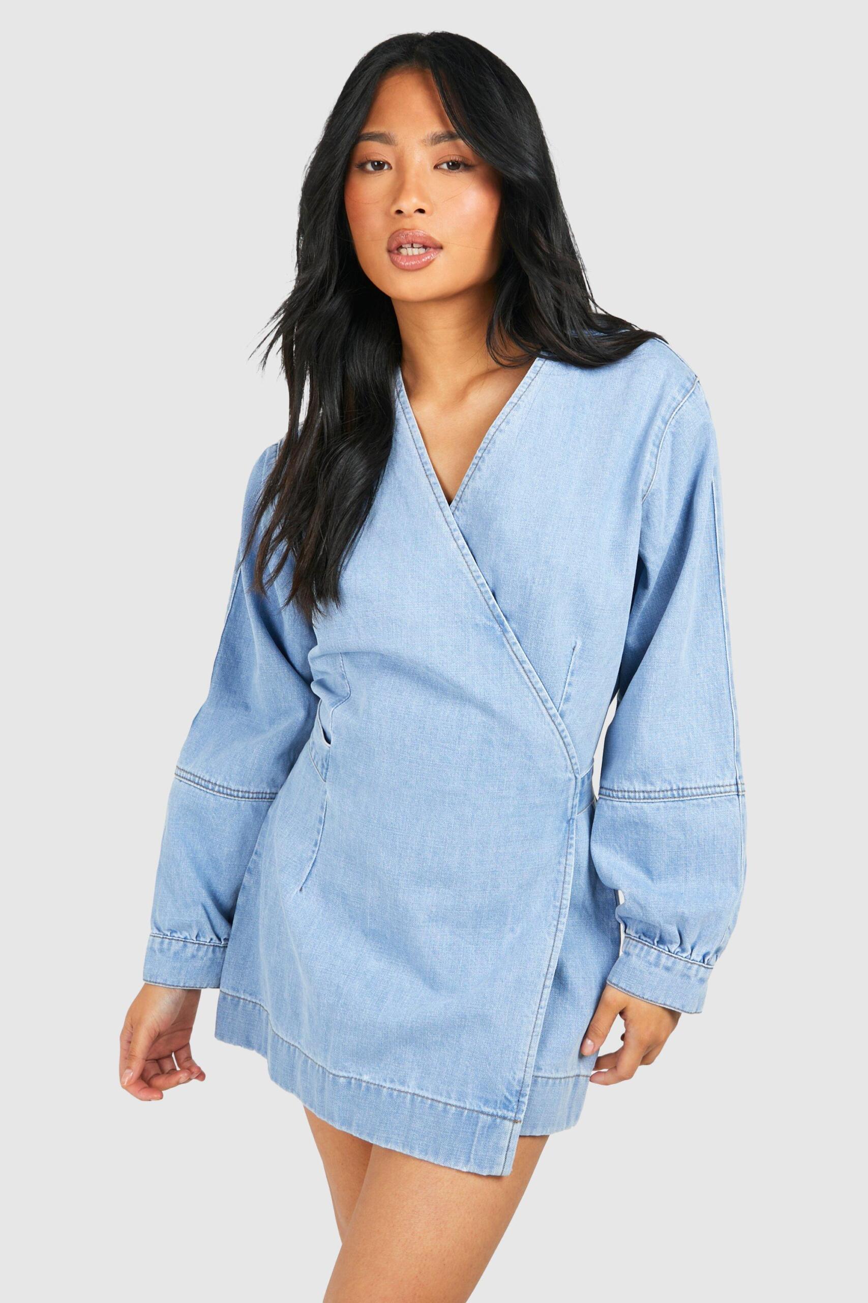 Womens Petite Volume Sleeve Denim Wrap Dress